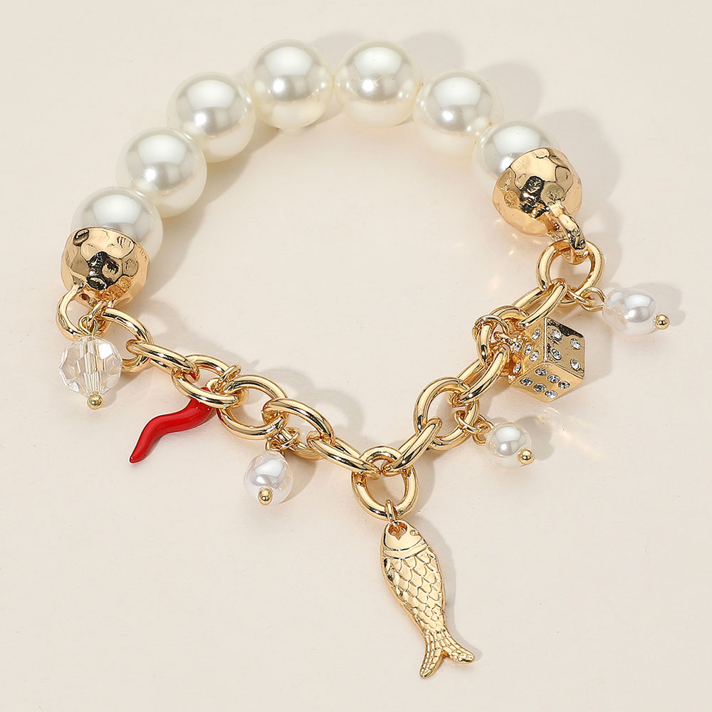 SECRET BOX_Fish Dice Chili Charm Pearl Beaded Stretch Bracelet