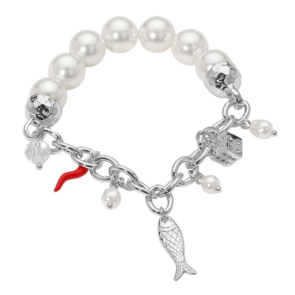 Details • Size : 0.5" H • Charm Size : 1" L • Stretchable • Unique charm bracelet featuring polished beads and whimsical accents like a fish, dice, and chili pepper. A playful accessory for adding fun detail to your outfit. Stretch design ensures all-day comfort. • Brass