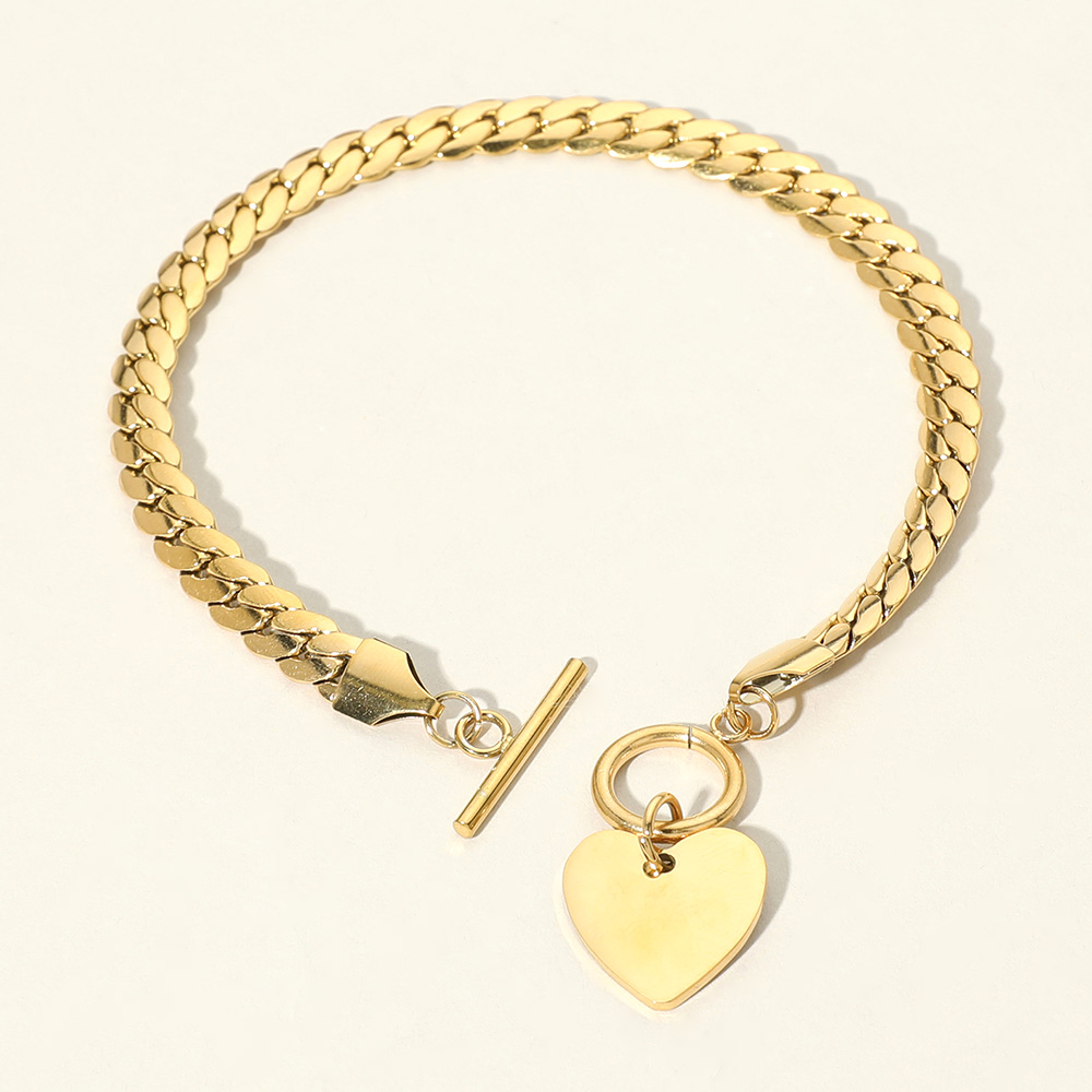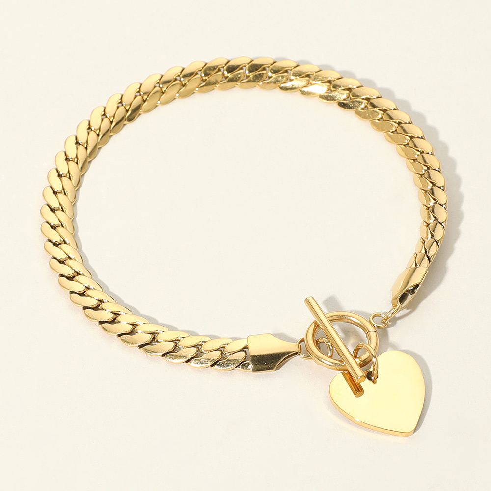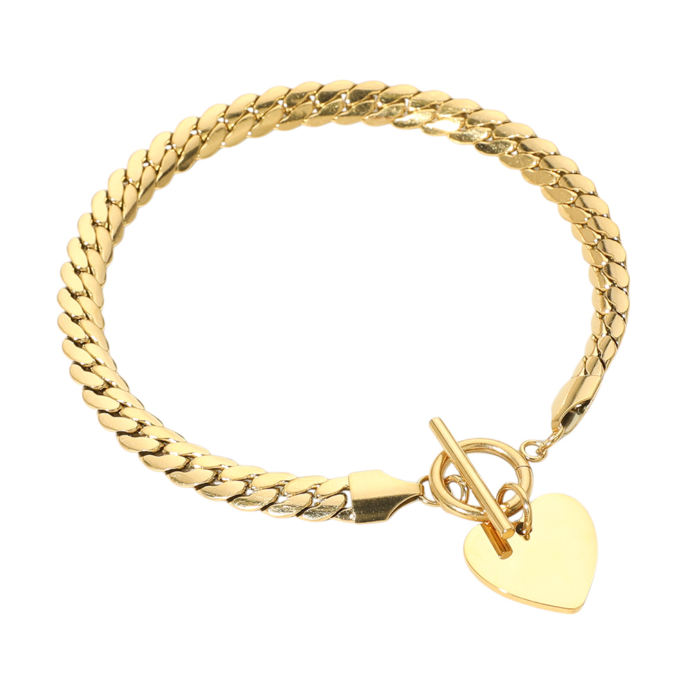 • Stylish chain bracelet featuring a sleek heart charm and secure toggle clasp. Made with durable material and polished for a modern finish. Ideal for everyday wear or as a thoughtful gift.