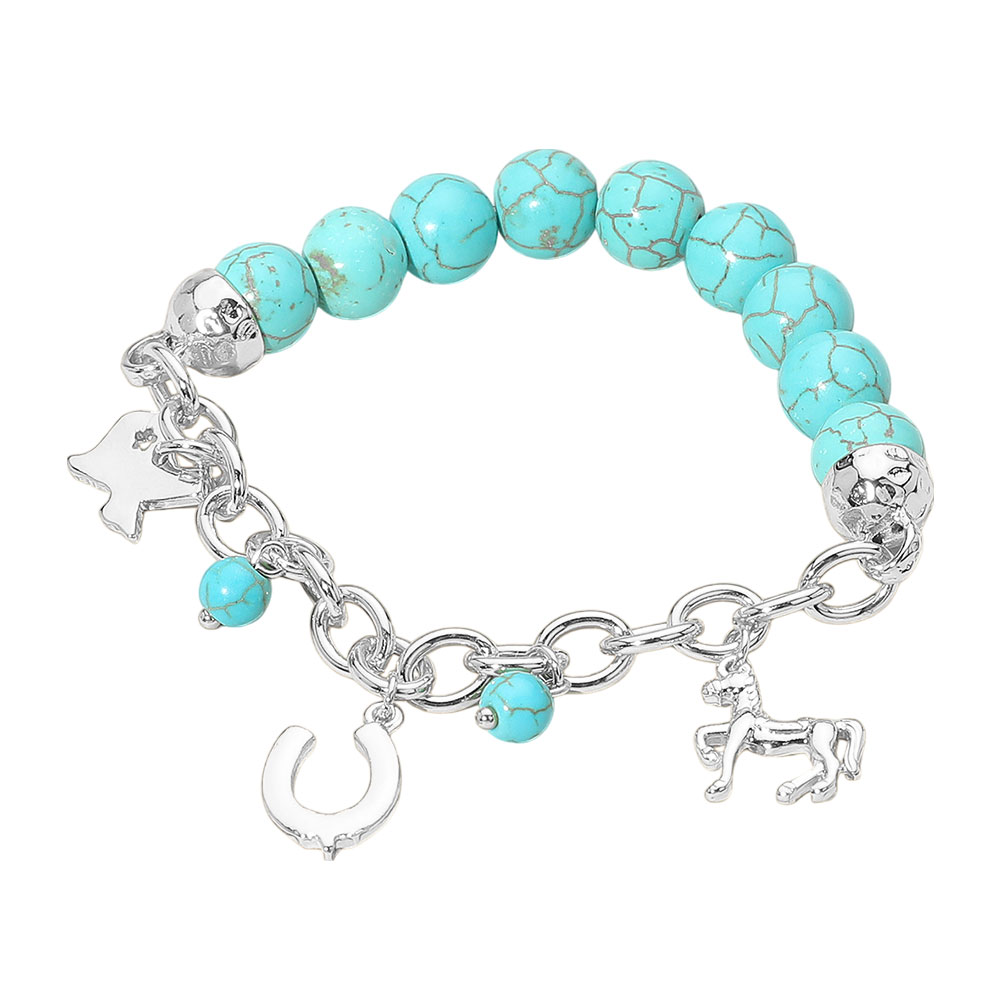 SECRET BOX_Western Horse Horseshoe Texas Map Charm Station Turquoise Stone Beaded Stretch Bracelet