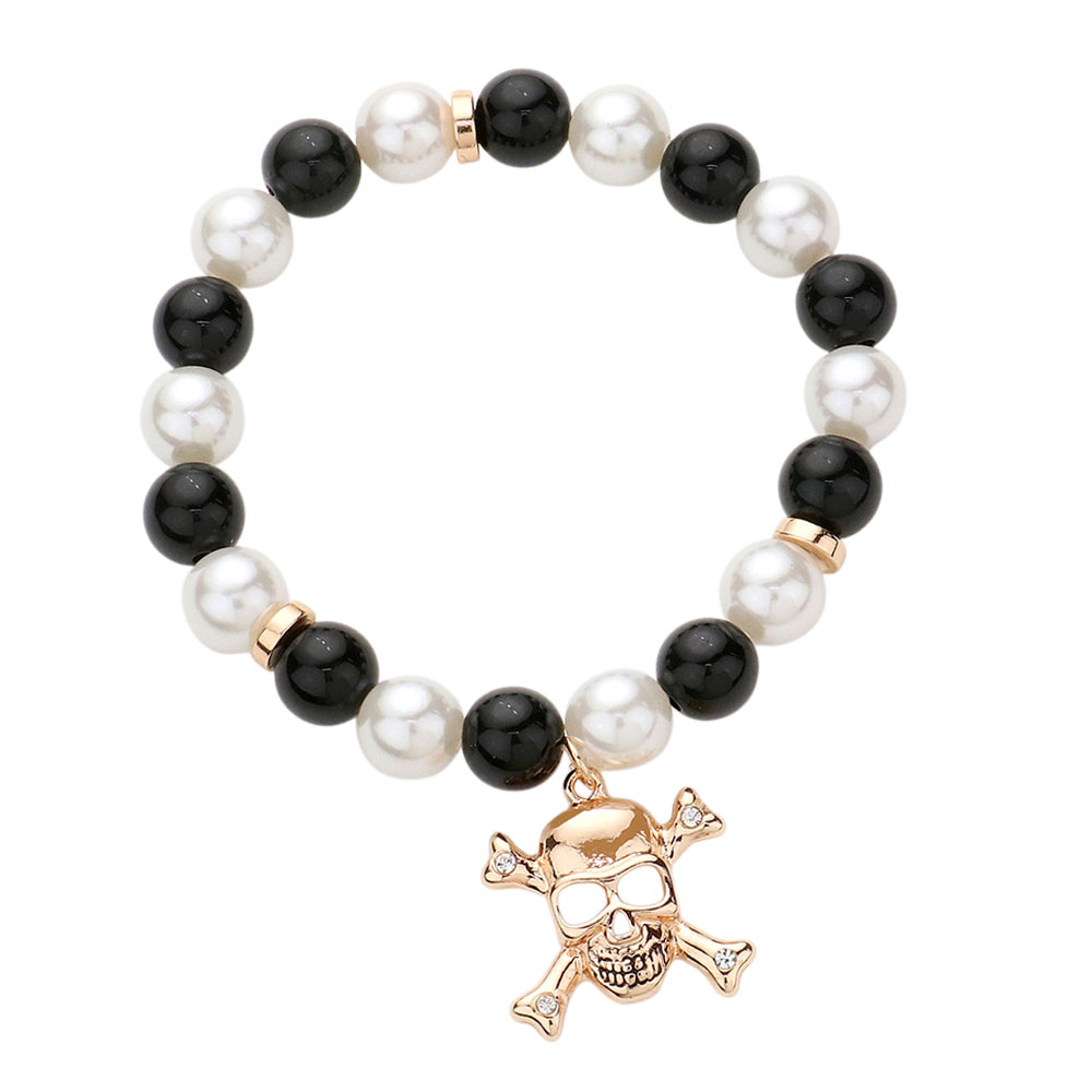 Details • Size : 1.25" H • Stretchable • Bold stretch bracelet featuring alternating beads with a striking skull and crossbones charm. A stylish statement piece that adds edgy flair, perfect for Halloween or everyday fashion with attitude. • Lead and Nickel Compliant