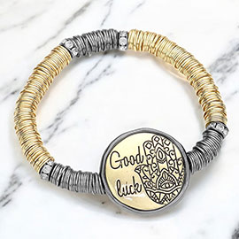 "Good luck" Evil Eye Hamsa Hand Flat Metal Bead Cluster Stretch Bracelet