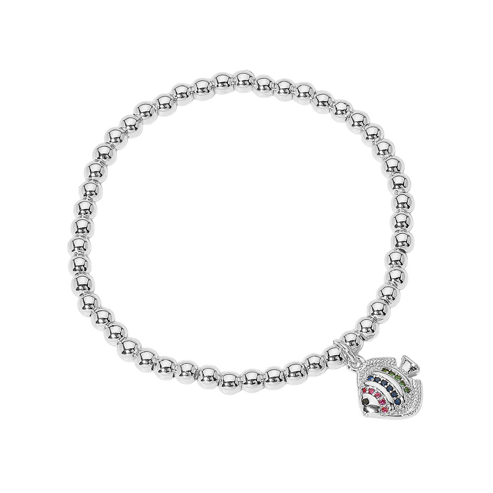 Stainless Steel Ball Stone Paved Fish Charm Beaded Stretch Bracelet