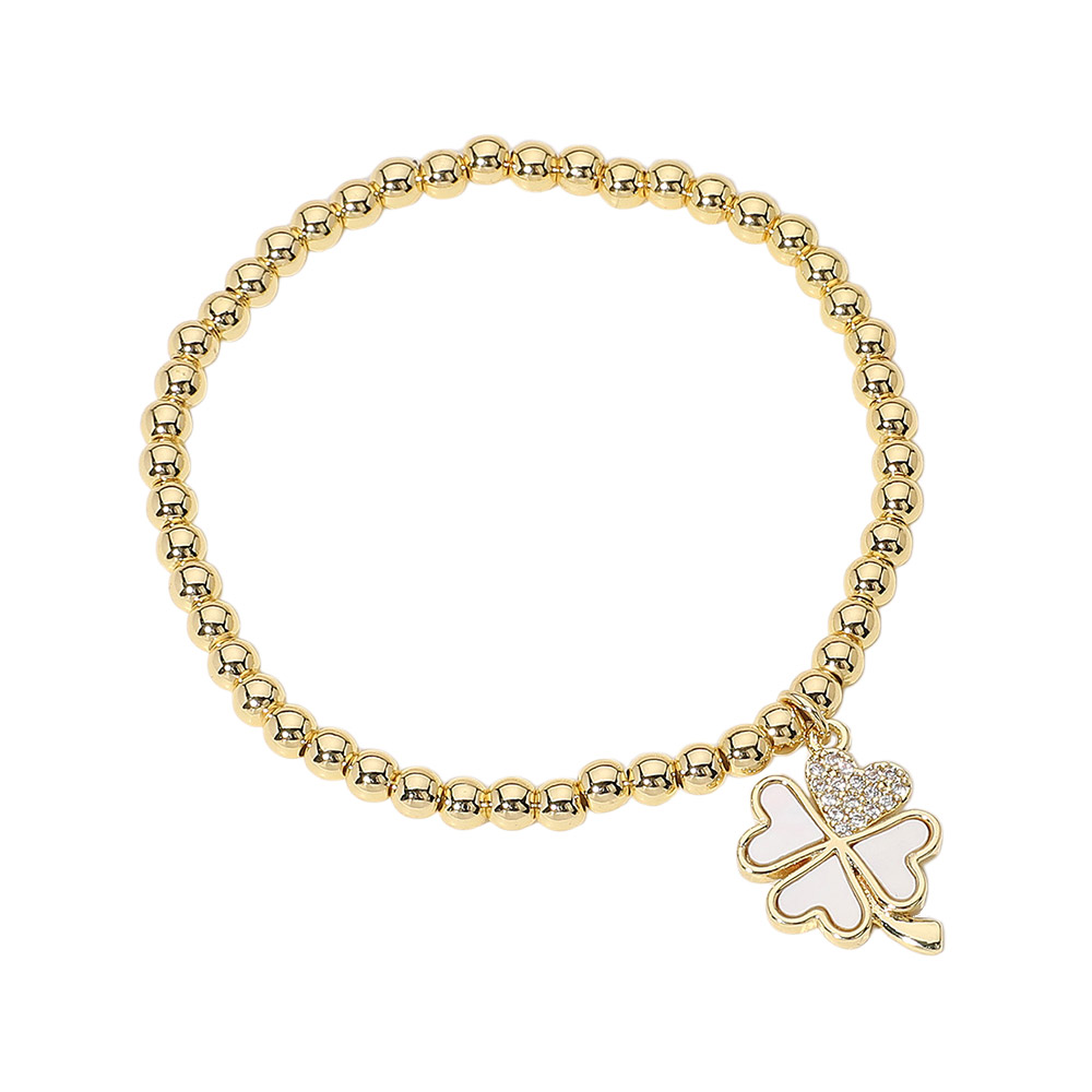 Stainless Steel Ball Stone Paved Mother of Pearl Clover Charm Beaded Stretch Bracelet Stainless Steel Ball Stone Paved Mother of Pearl Clover Charm Beaded Stretch Bracelet