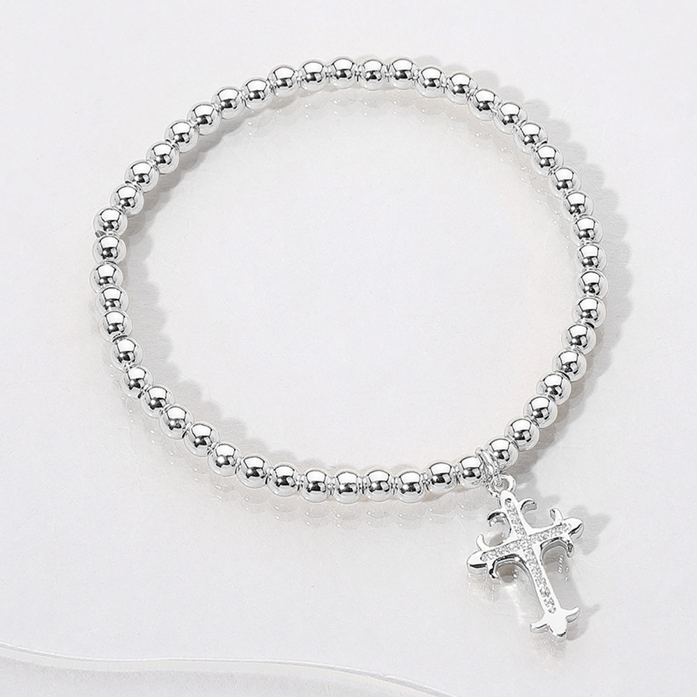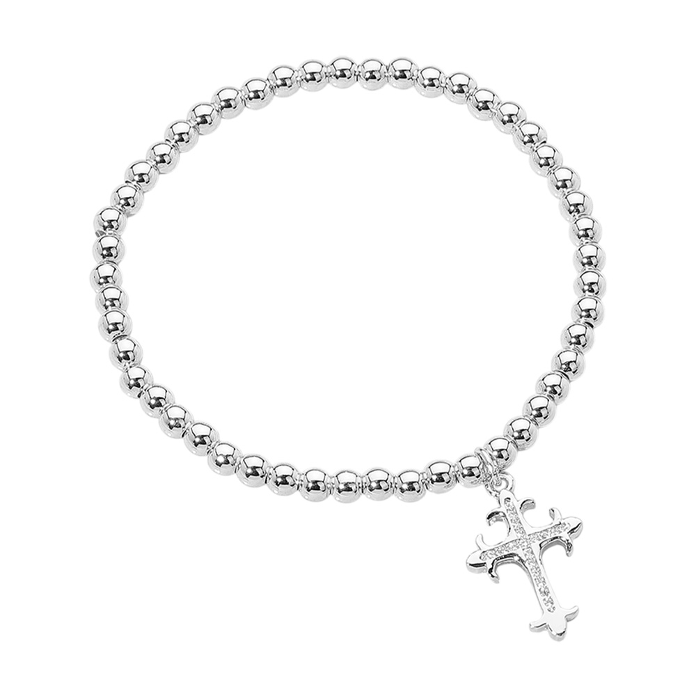 Details • Size : 0.2" H • Charm Size : 0.6" X 1" • Stretchable • Minimalist stretch bracelet designed with polished round beads and a delicate hanging cross charm. A timeless piece ideal for layering or wearing solo, combining elegance and spiritual expression. • Stainless Steel