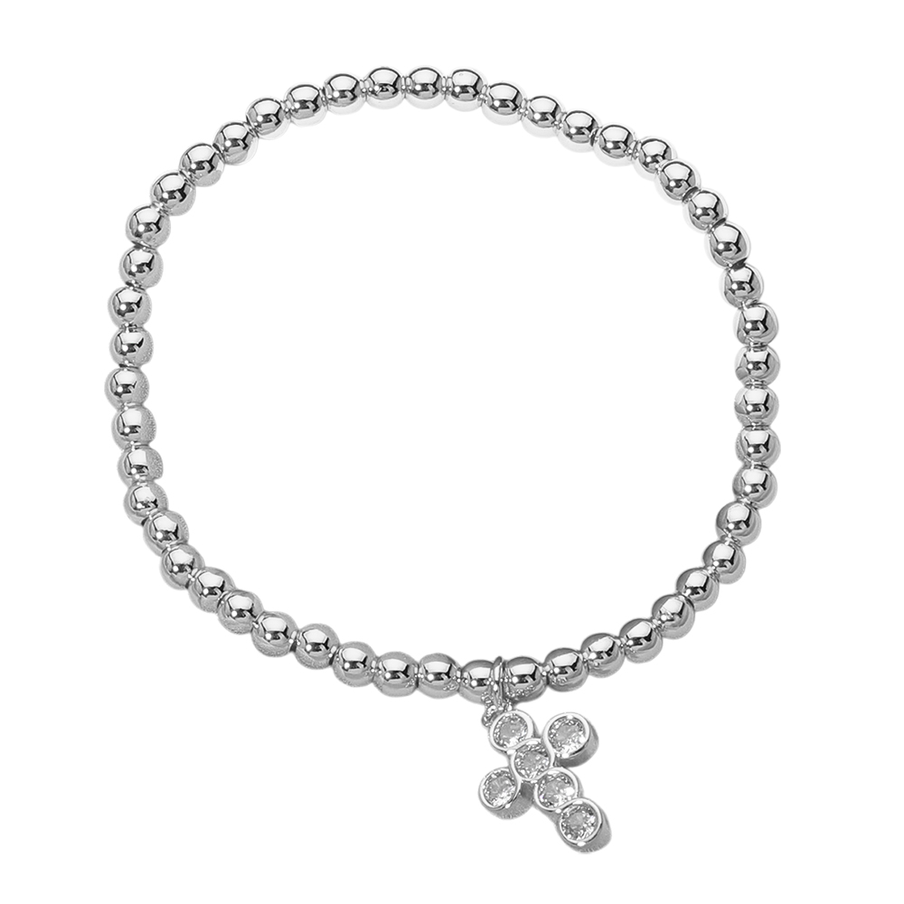 Stainless Steel Stone Cross Charm Beaded Stretch Bracelet