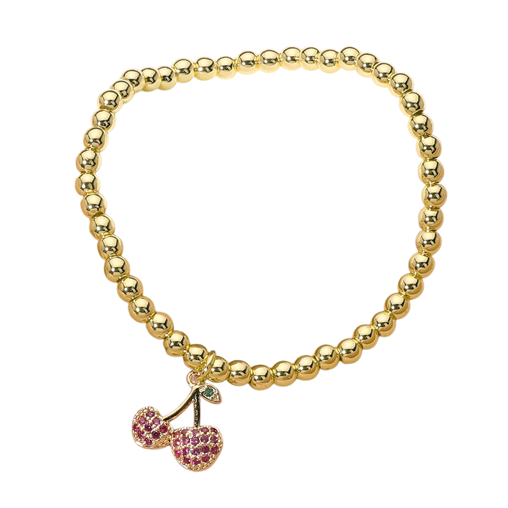 Stainless Steel Stone Paved Cherry Charm Beaded Stretch Bracelet