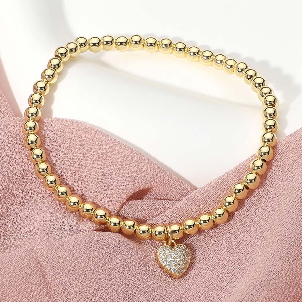 Stainless Steel Stone Paved Heart Charm Beaded Stretch Bracelet