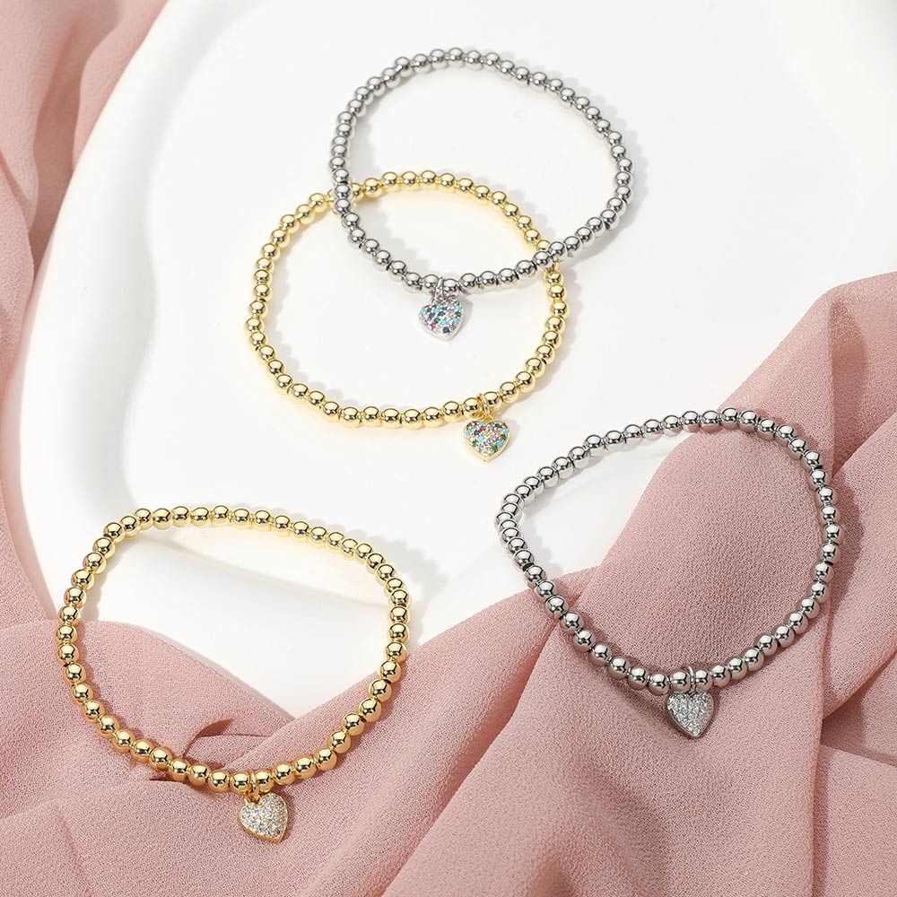 Stainless Steel Stone Paved Heart Charm Beaded Stretch Bracelet
