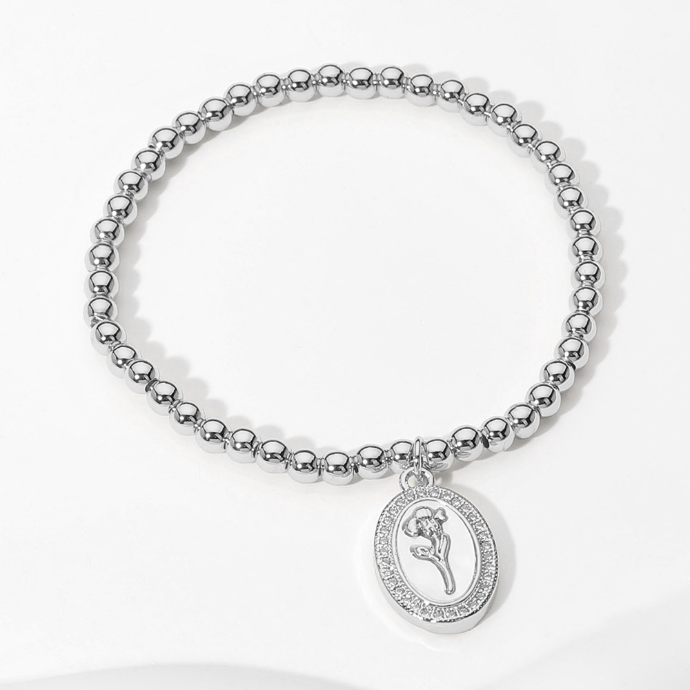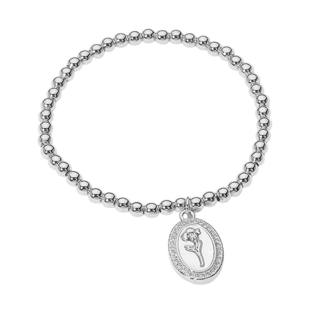 Stainless Steel Stone Paved Tulip Flower Embossed Mother of Pearl Oval Charm Beaded Stretch Bracelet