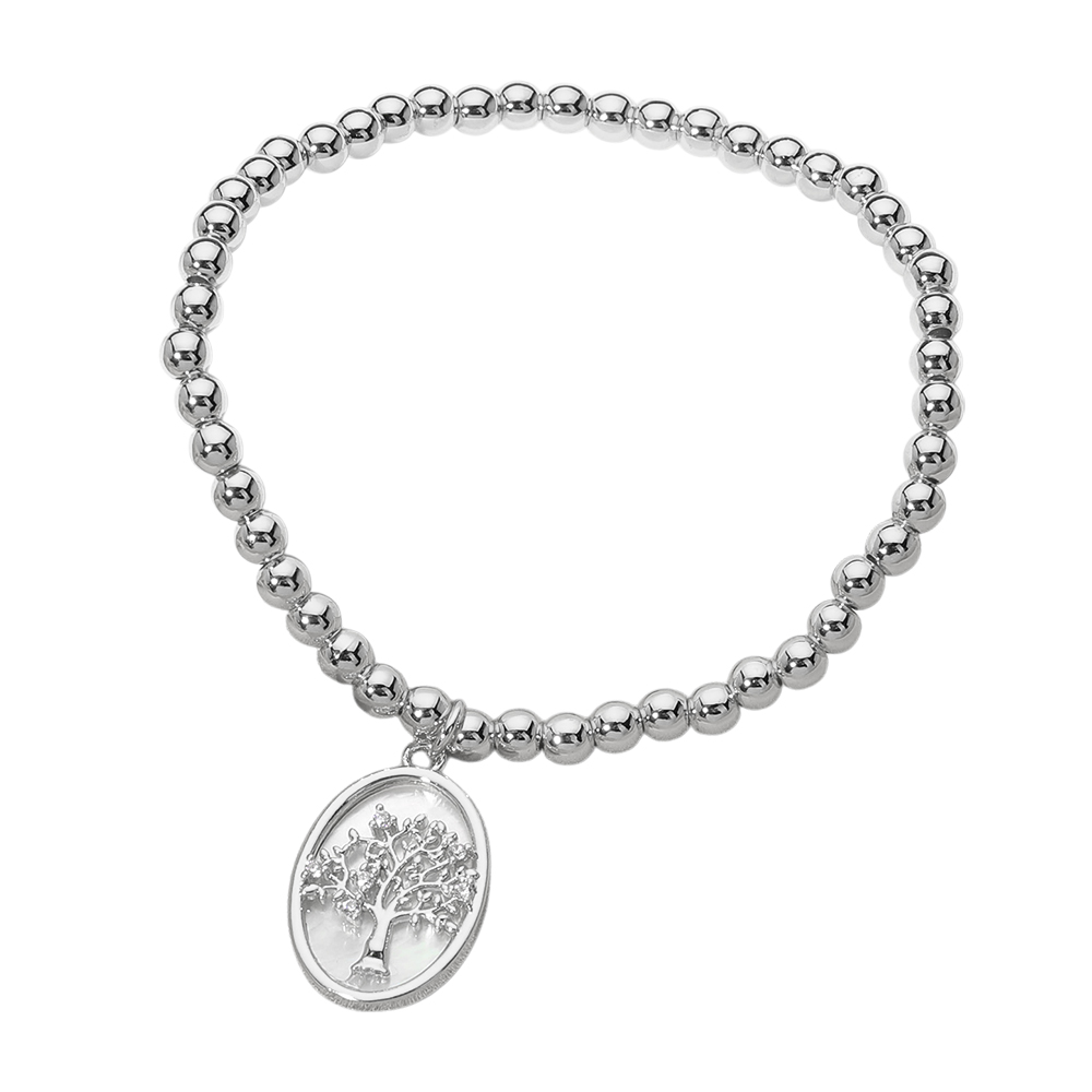Stainless Steel Tree of Life Embossed Mother of Pearl Oval Charm Beaded Stretch Bracelet