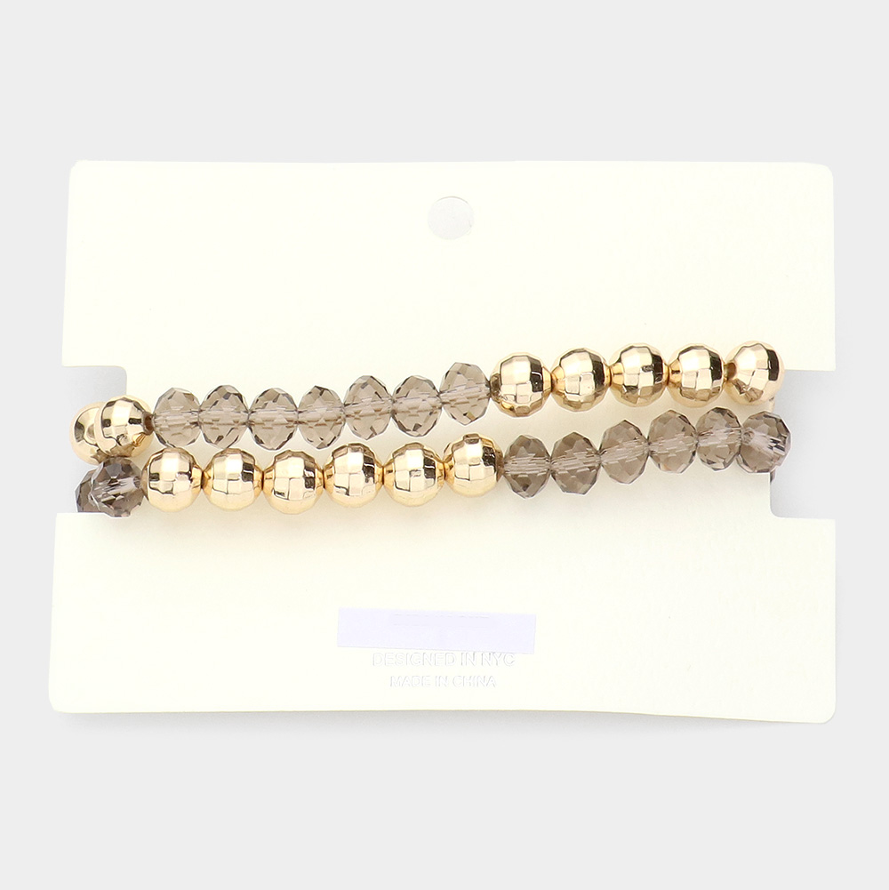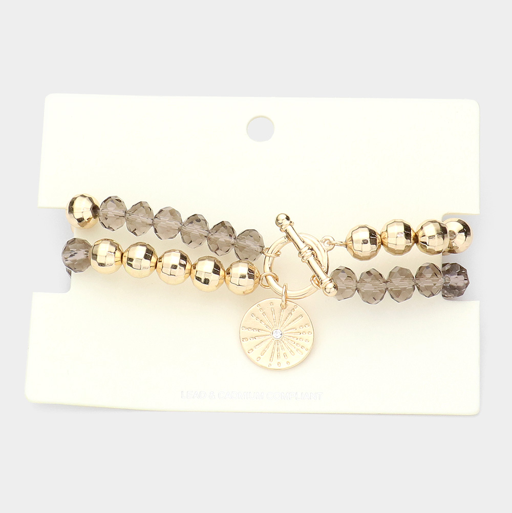 Stone Centered Metal Disc Charm Faceted Beaded Stretch Bracelet