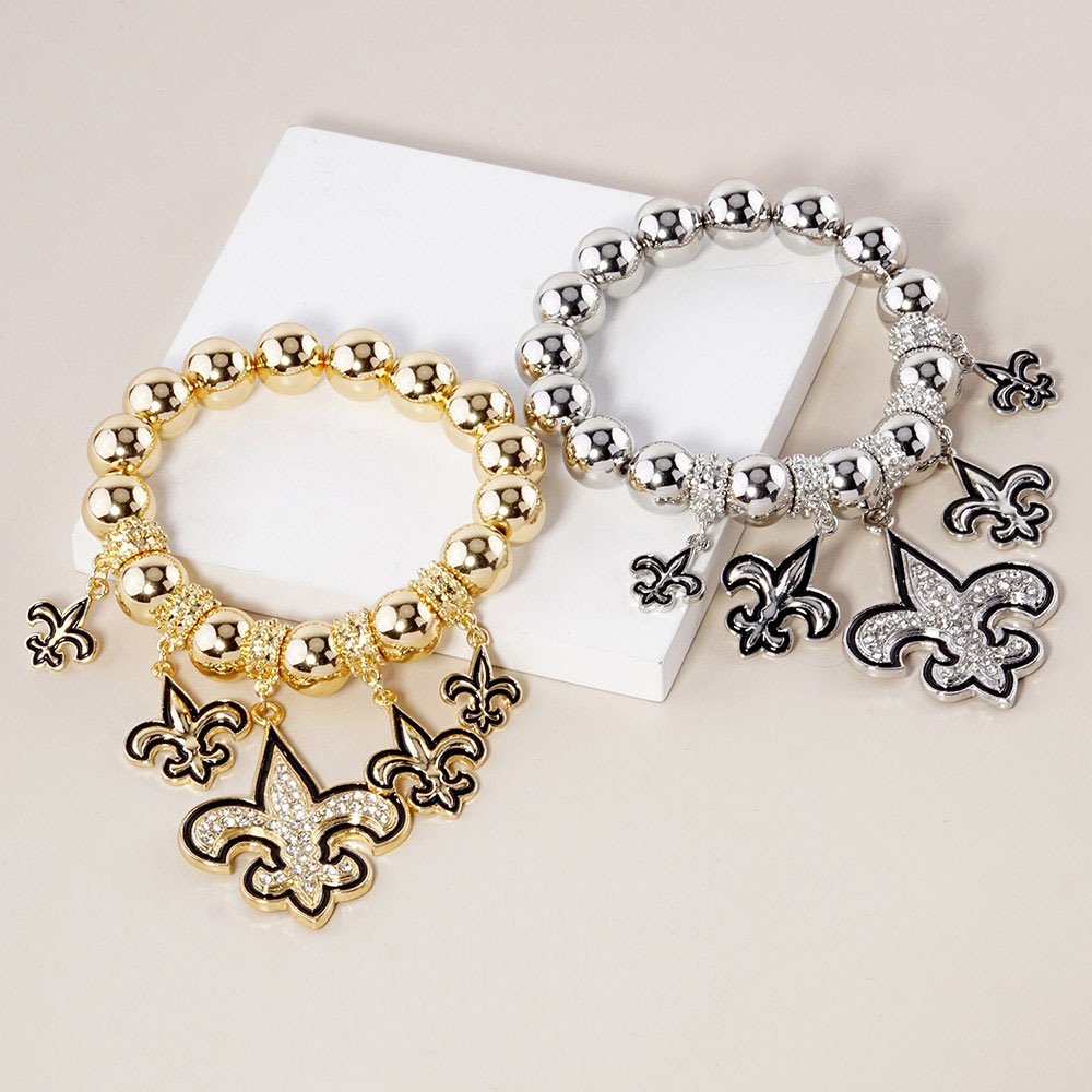 Stone Embellished Fleur de Lis Charm Metal Ball Stretch Bracelet