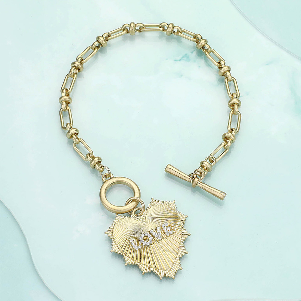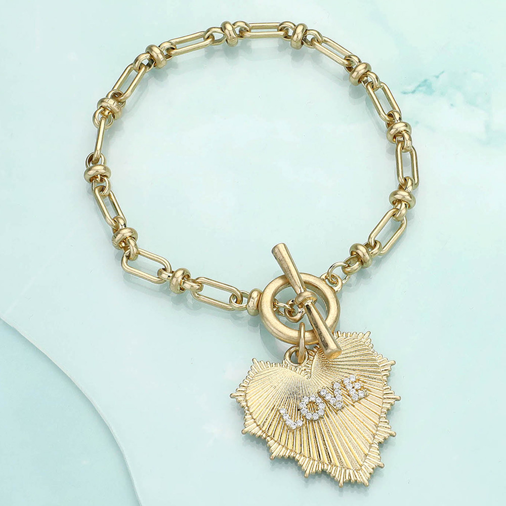 Details • Size : 7" + 0.5" L • Charm Size : 1.2" X 1.75" • Toggle Closure • Chic gold link bracelet with a textured heart charm engraved with "LOVE" and a stylish toggle clasp. A perfect accessory to express elegance and affection in any outfit. • Lead and Nickel Compliant