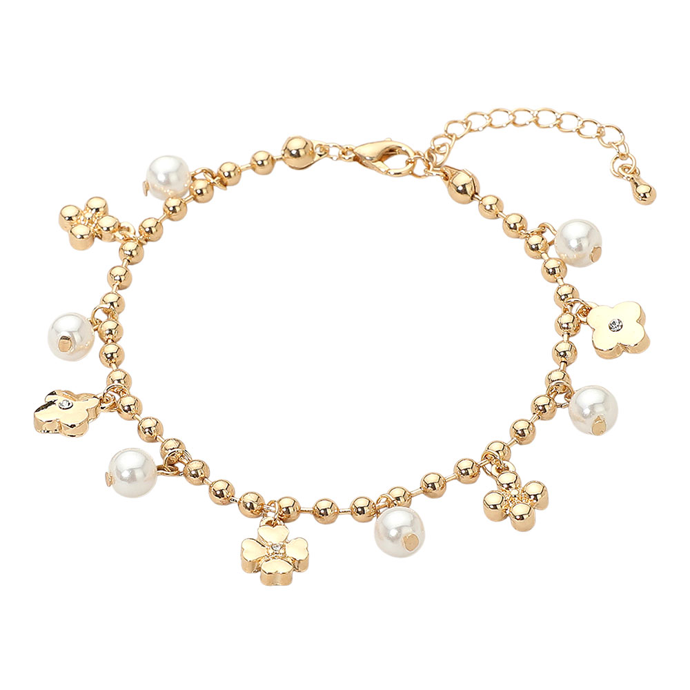 Details • Size : 0.2" H, 7" + 2" L • Charm Size : 0.4" L • Lobster Clasp Closure • This delicate bracelet features a mix of floral charms and pearl accents on a beaded chain for a graceful, feminine touch. The adjustable clasp ensures a perfect fit, making it an ideal accessory for both everyday wear and special occasions. • Lead and Nickel Compliant