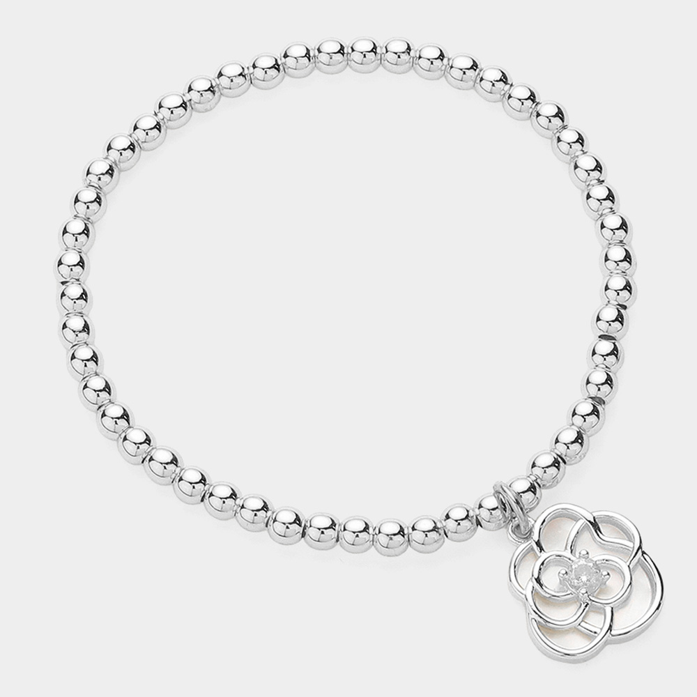 Stone Pointed Rose Charm Stainless Steel Ball Beaded Stretch Bracelet