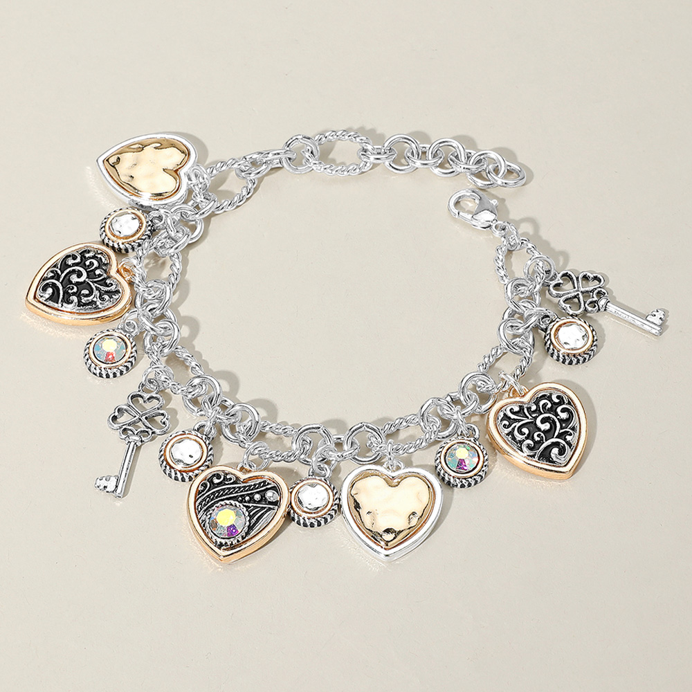 Two Tone Antique Metal Heart Clover Key Stone Charm Station Bracelet