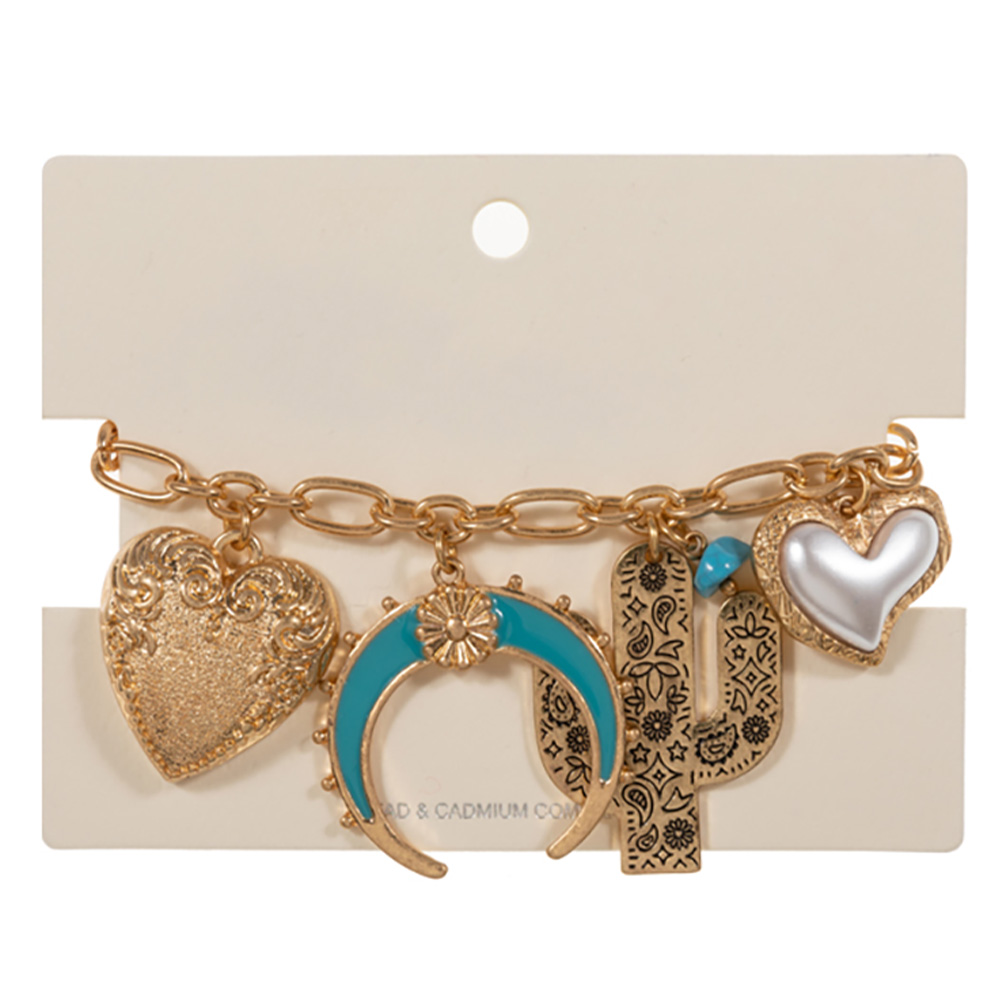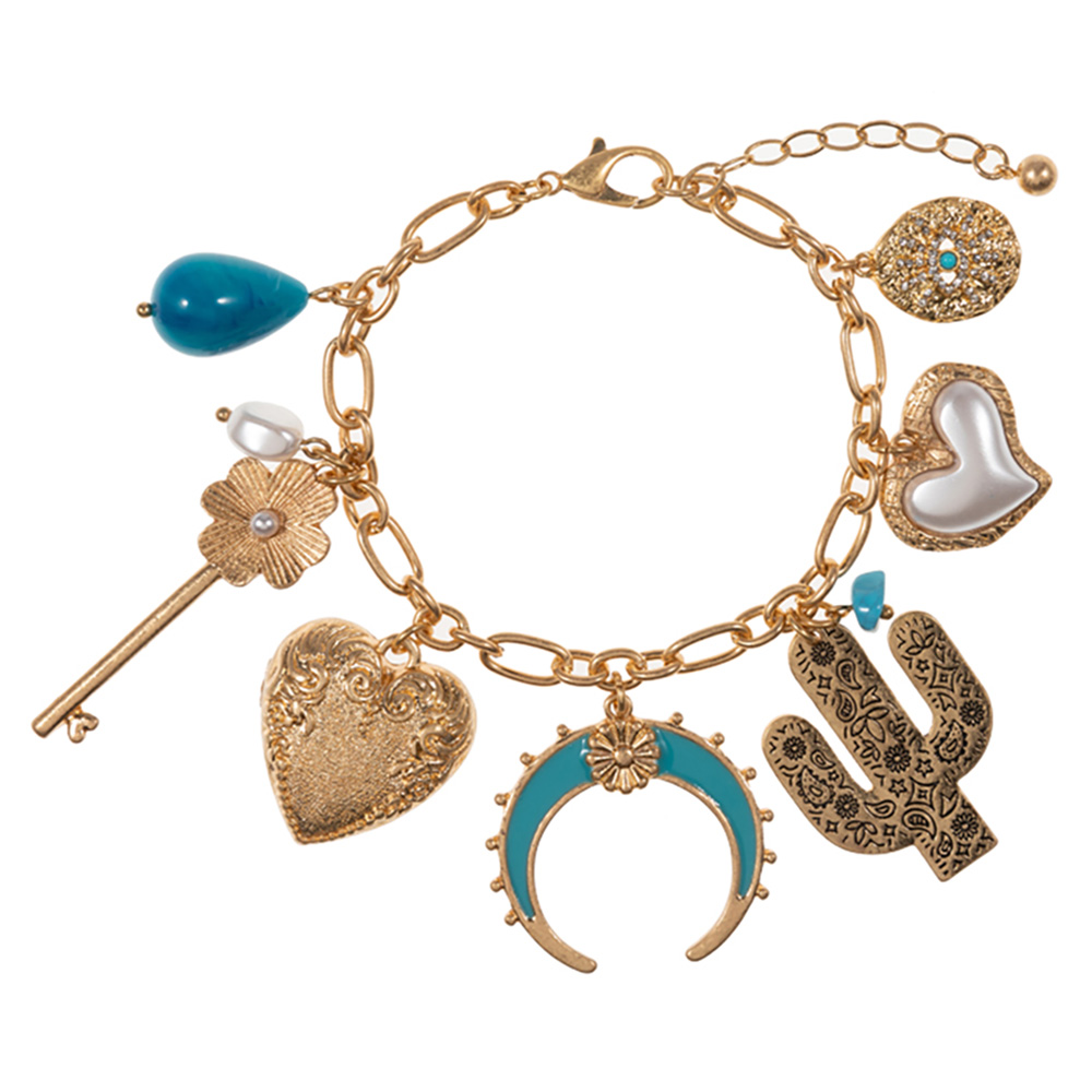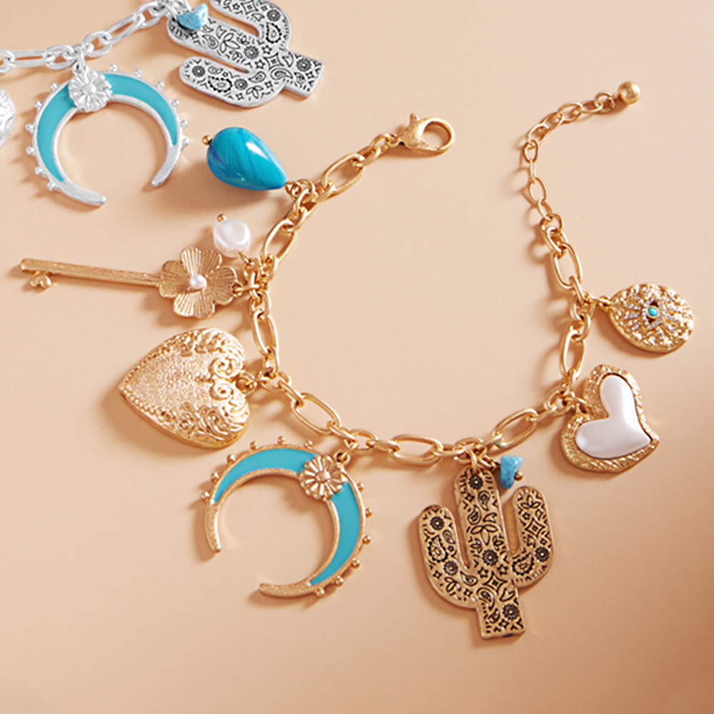 Western Cactus Pearl Heart Metal Flower Key Crescent Charm Station Bracelet