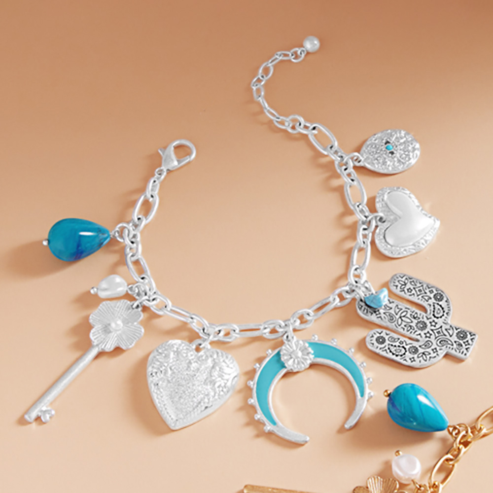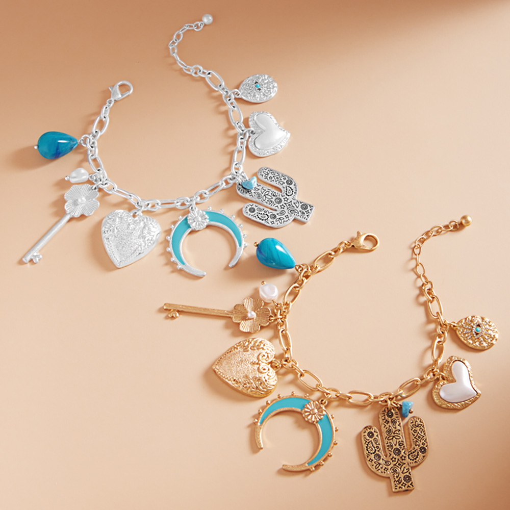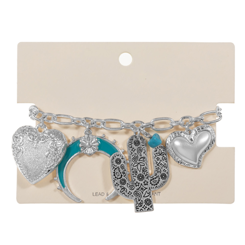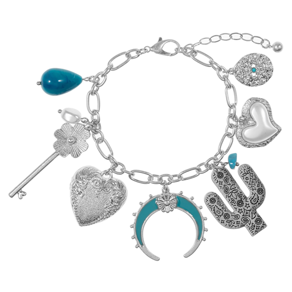 Western Cactus Pearl Heart Metal Flower Key Crescent Charm Station Bracelet