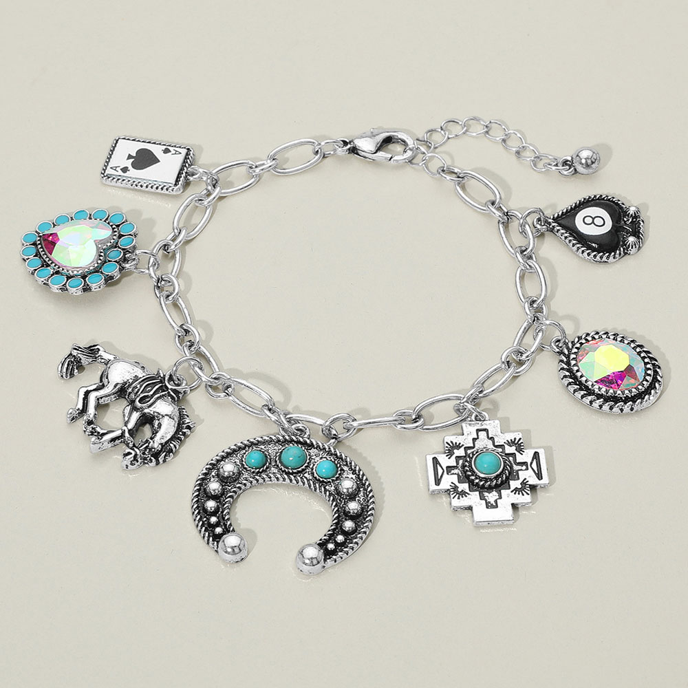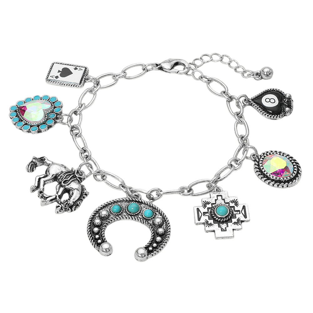 Details • Size : 1.25" H, 7.5" + 2.25" L • Lobster Clasp Closure • Western-inspired charm bracelet with unique accents including horse, horseshoe, and heart motifs. Designed with a secure clasp and adjustable length, this bracelet adds playful style to any casual or themed outfit. • Lead and Nickel Compliant