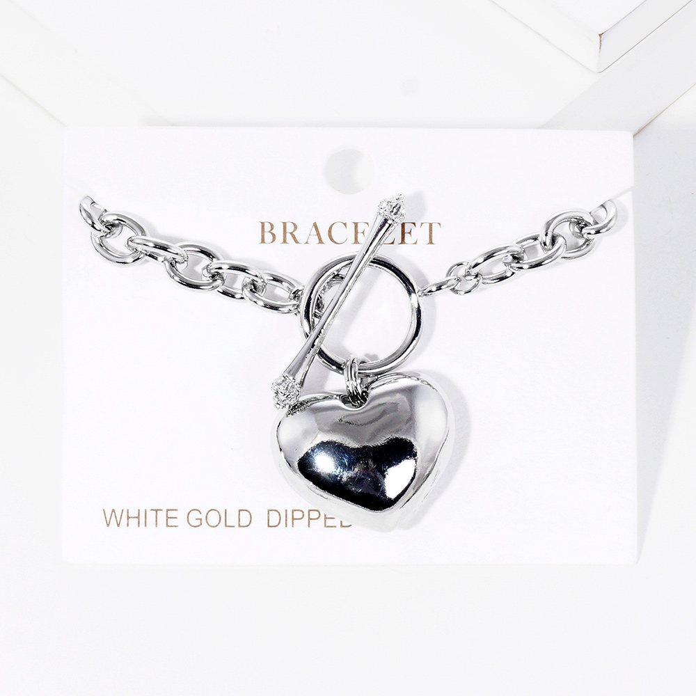 White Gold Dipped Metal Heart Charm Toggle Bracelet