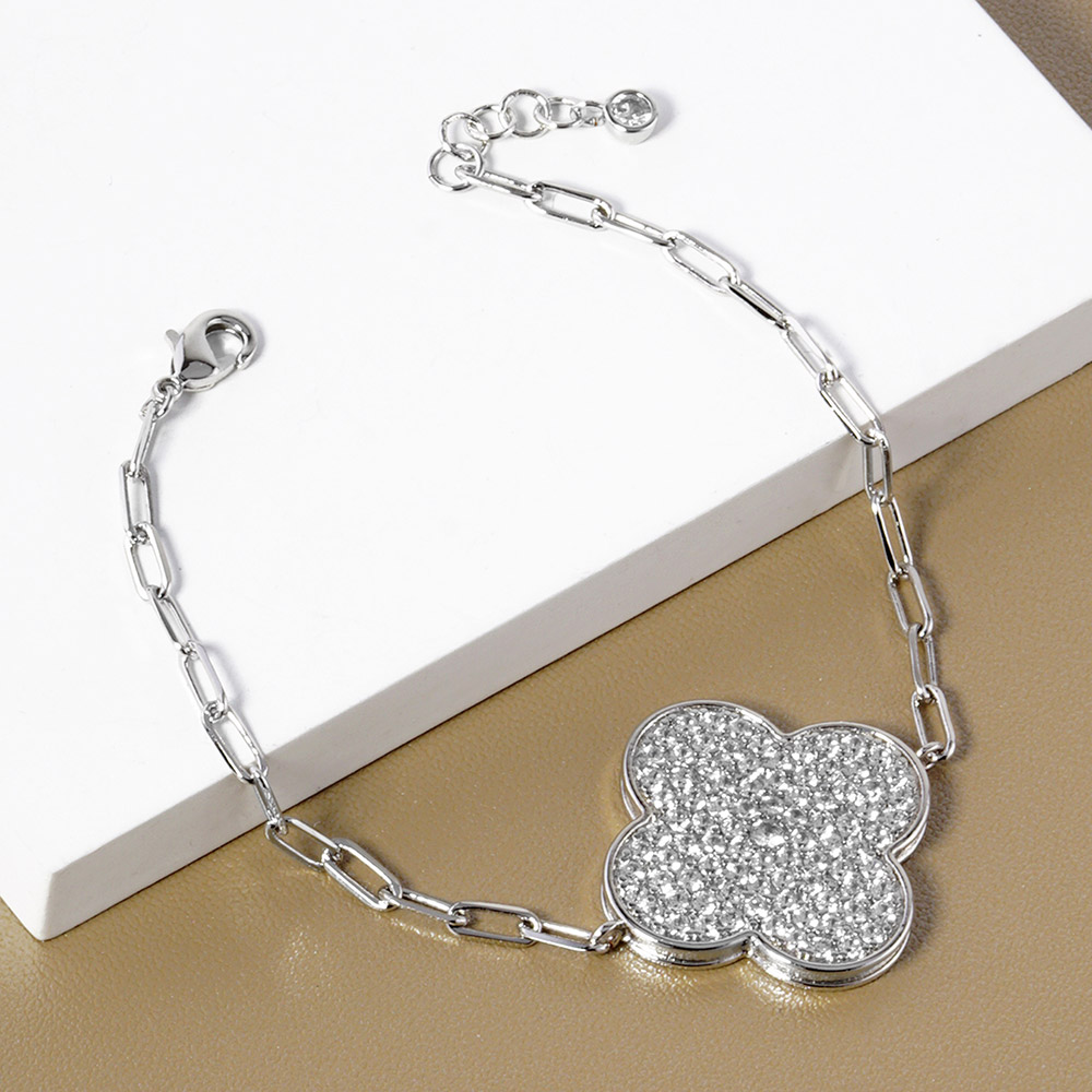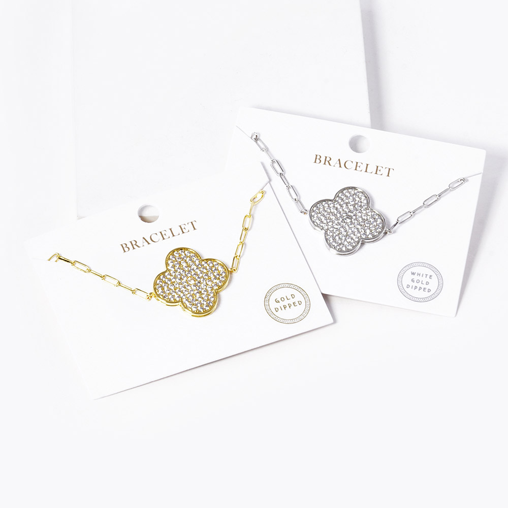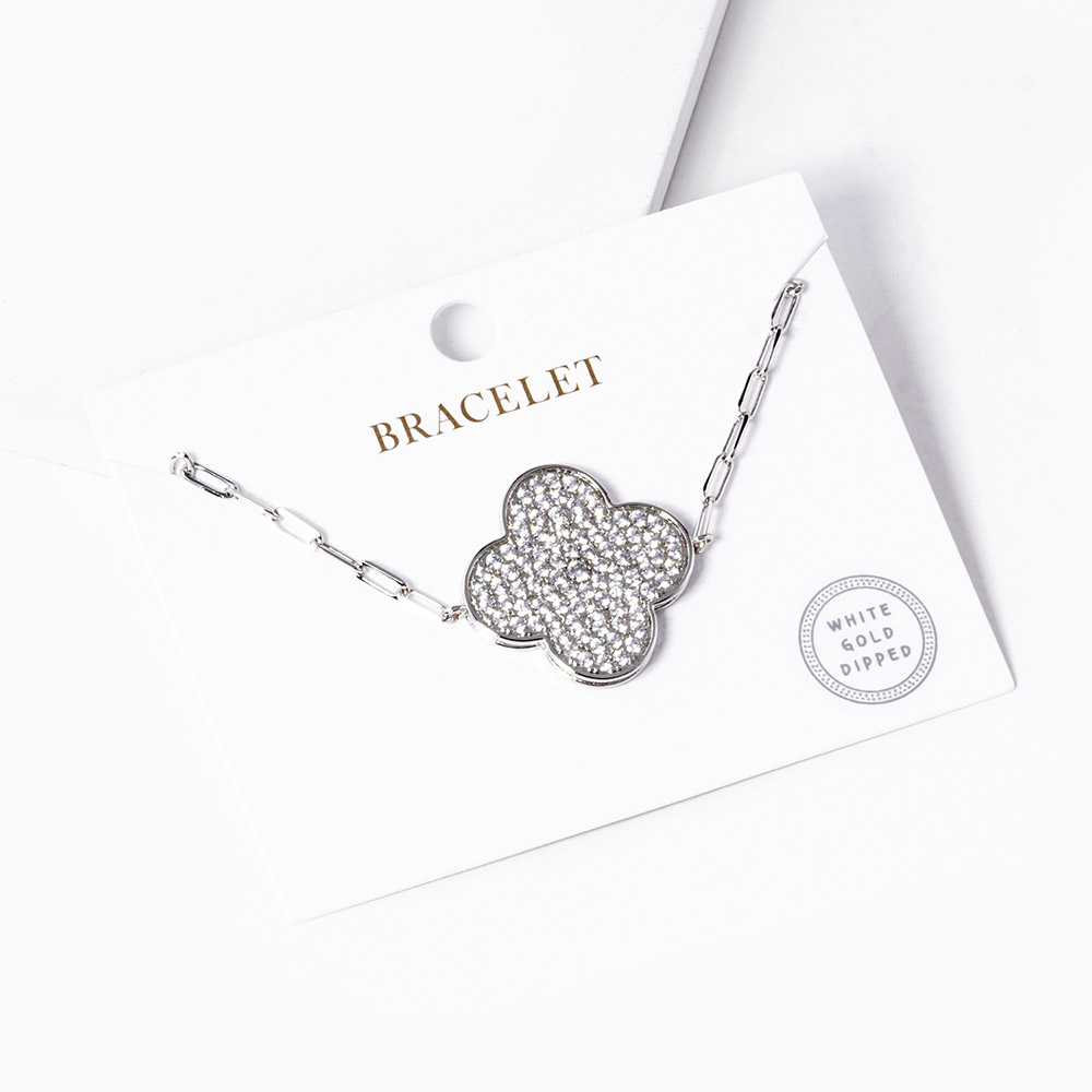 Gold Dipped Stone Paved Quatrefoil Charm Pointed Paperclip Chain Bracelet