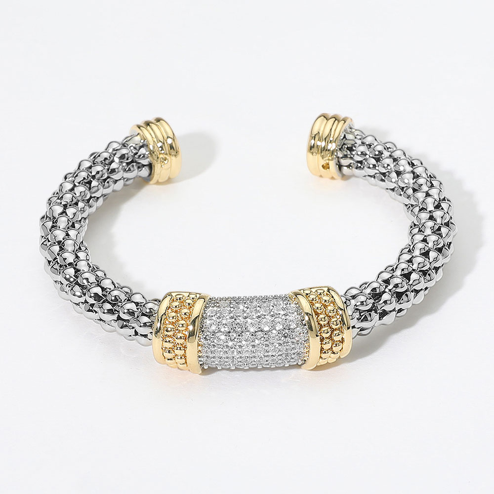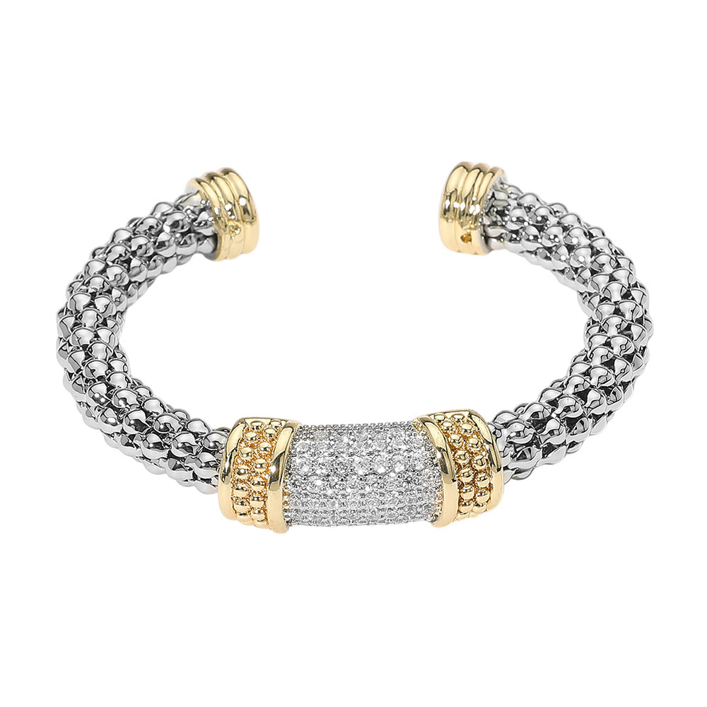 • Make a bold statement with this two-tone cable cuff bracelet, featuring dazzling pave CZs and intricate gold-tone accents. Perfect for any occasion.