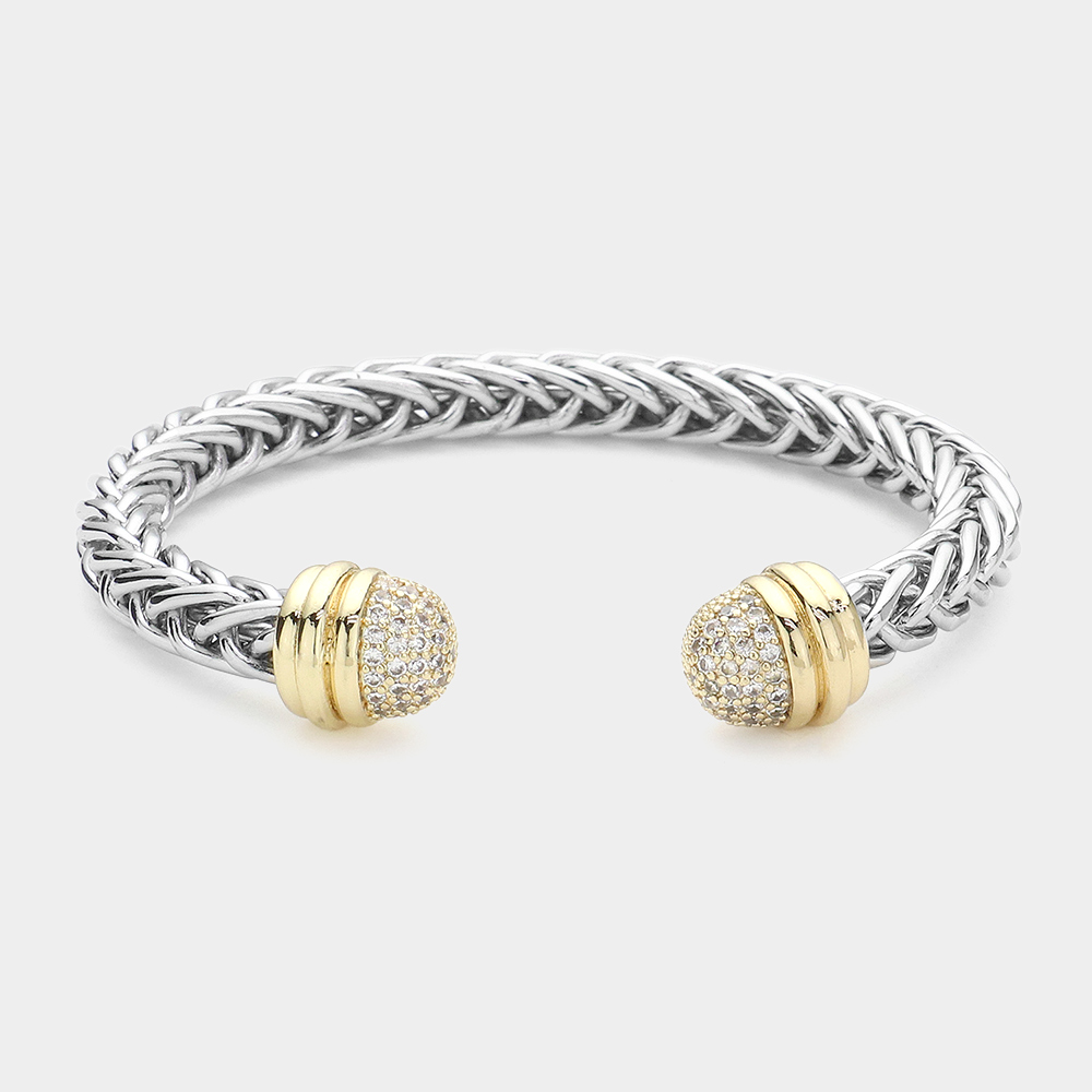 Details • Size : 0.5" H, 2.25" D • Cuff • Elegant open cuff bracelet designed with a braided band and sparkling crystal end accents. This refined piece offers a balanced blend of classic texture and modern shine, making it ideal for everyday wear, special occasions, stacking, or adding a polished finish to curated jewelry collections. • Gold Dipped • CZ Cubic Zirconia