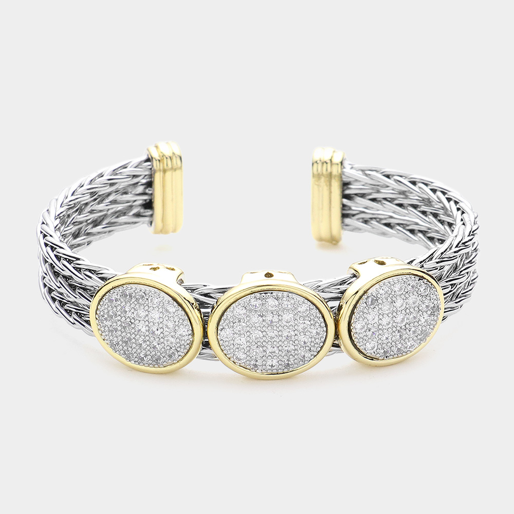 14K Gold Plated CZ Stone Paved Triple Oval Pointed Braided Metal Cuff Bracelet