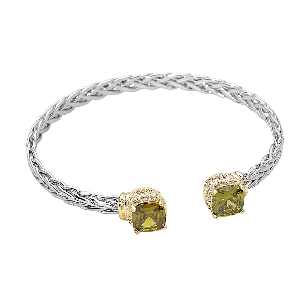 14K Gold Plated CZ Stone Tip Two Tone Braided Cuff Bracelet