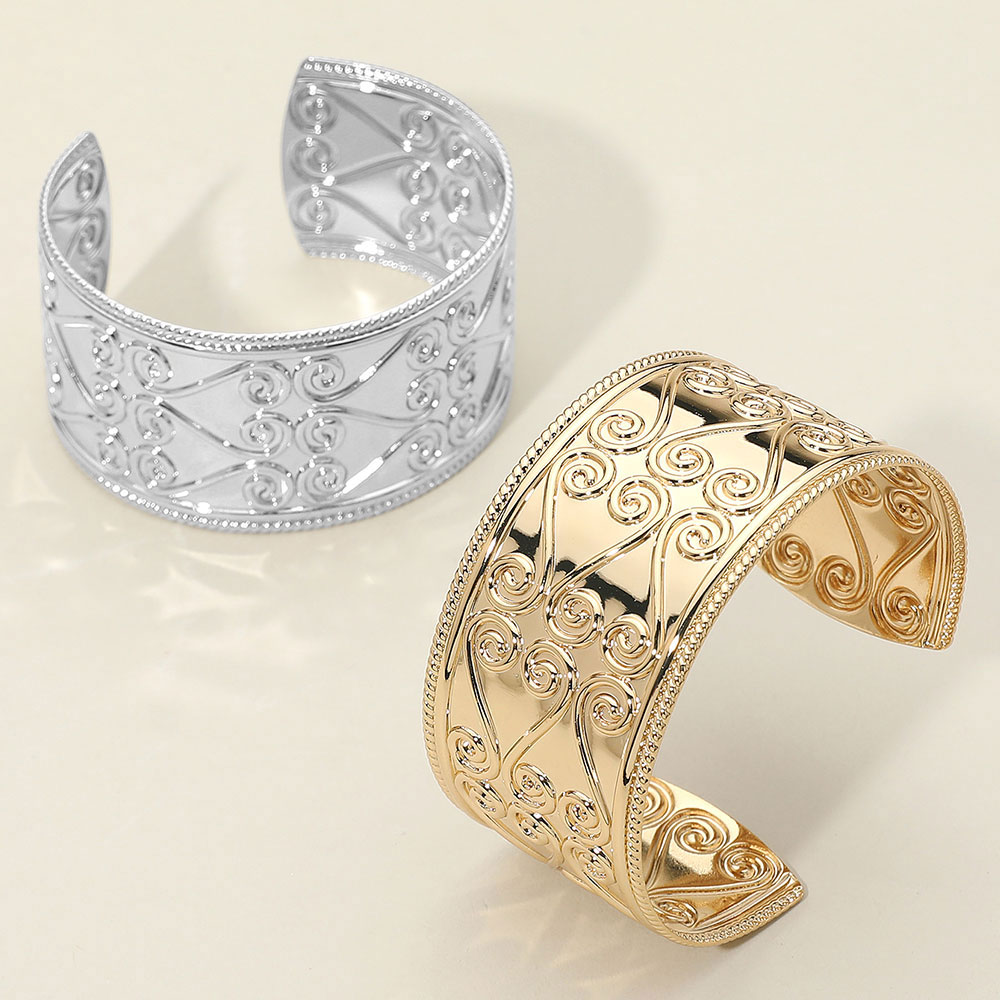 Details • Size : 1.25" H, 2.3" D • Cuff • Elevate your accessory game with this wide filigree open cuff bracelet featuring an elegant swirl design. Ideal for adding a bold yet sophisticated touch to casual or formal outfits. Comfortable, easy-to-wear fit for all-day style. • Lead and Nickel Compliant