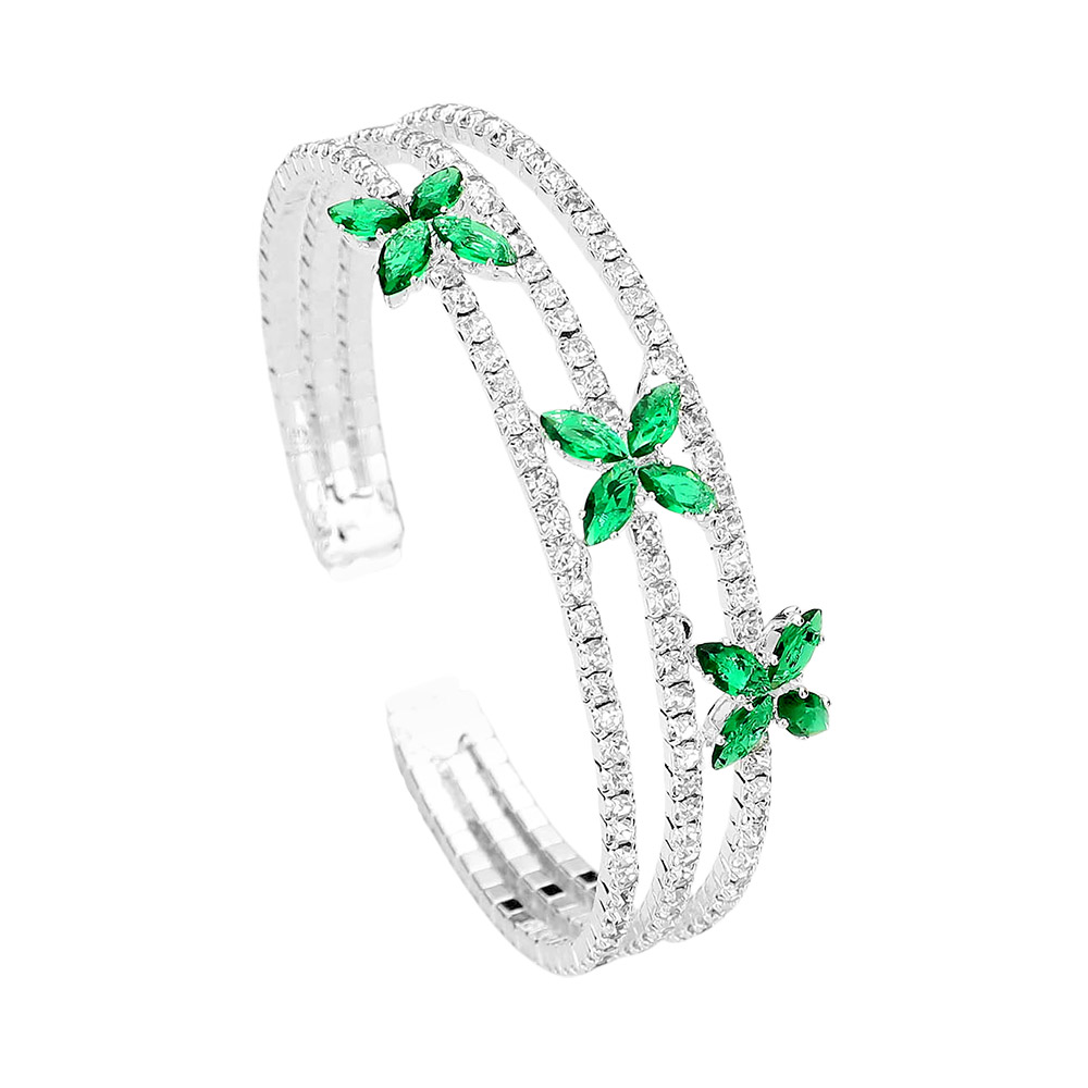 Details • Size : 0.7" H, 2.25" D • Cuff • Delicate cuff bracelet adorned with butterfly accents and shimmering rhinestones, ideal for weddings, parties, or formal events. A refined accessory that adds charm and elegance to any outfit. • Lead and Nickel Compliant • CZ Cubic Zirconia