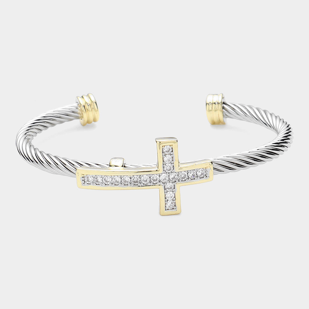 Details • Size : 0.7" H • Cuff • Elevate your accessory game with this twisted cable cross cuff bracelet, featuring a sleek two-tone finish and a sparkling cubic zirconia cross centerpiece. Designed for comfort and style, it's a meaningful piece that blends faith and fashion for everyday wear or special occasions. • CZ Cubic Zirconia