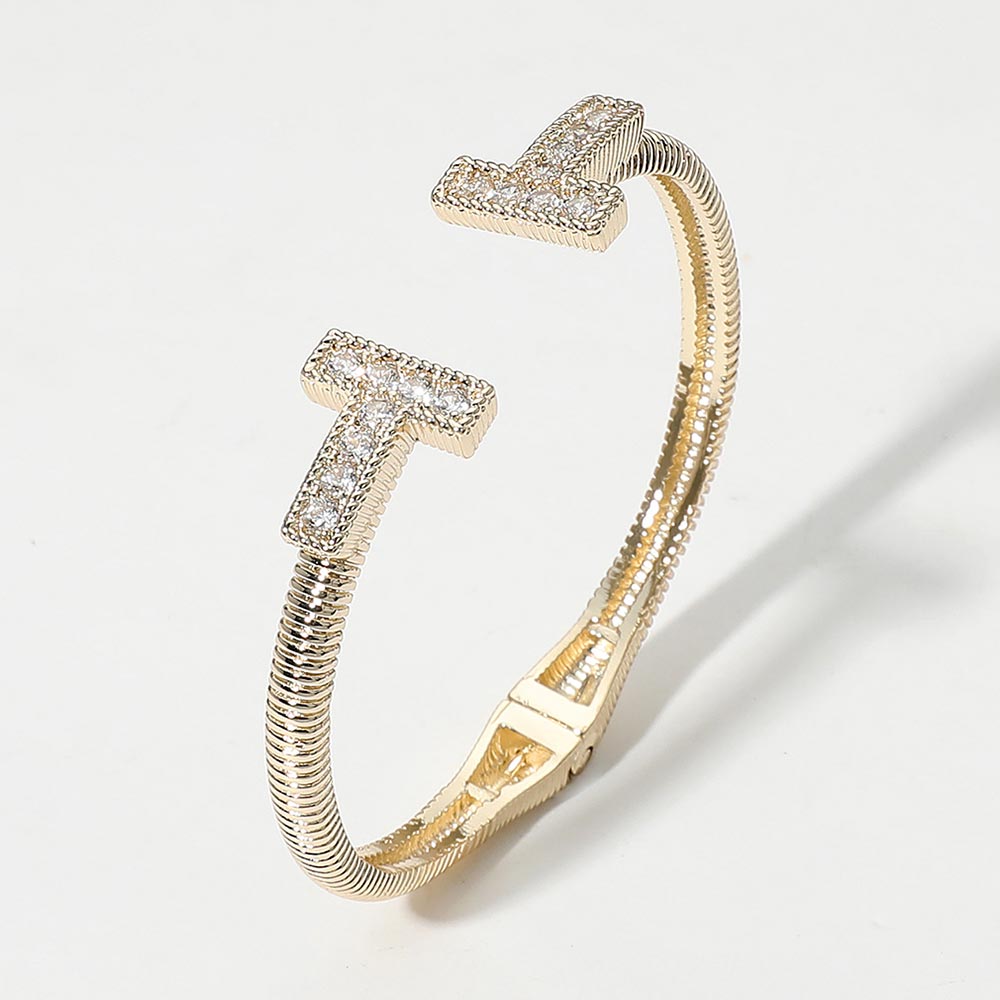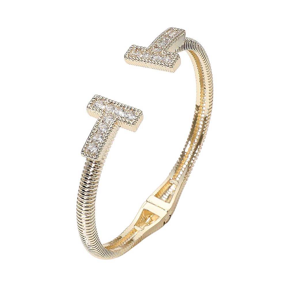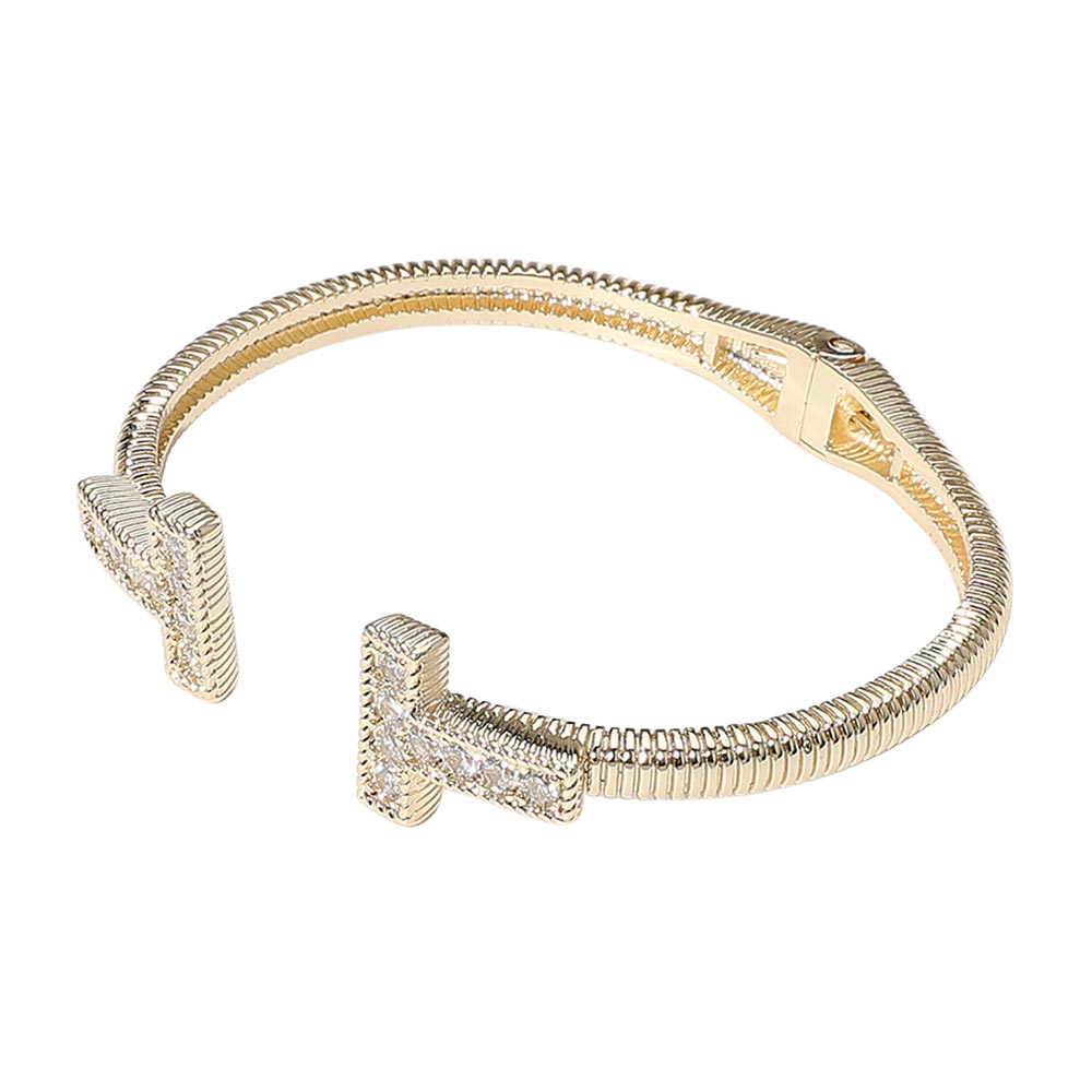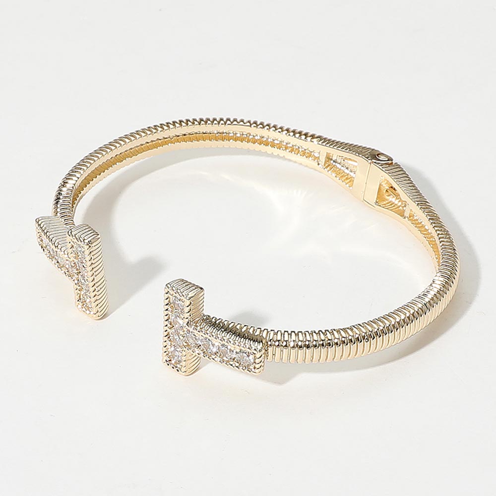 • Modern and stylish cuff bracelet featuring two pavĂ© crystal-encrusted "T" ends. A sleek, open design that adds a touch of sparkle and sophistication to any ensemble.