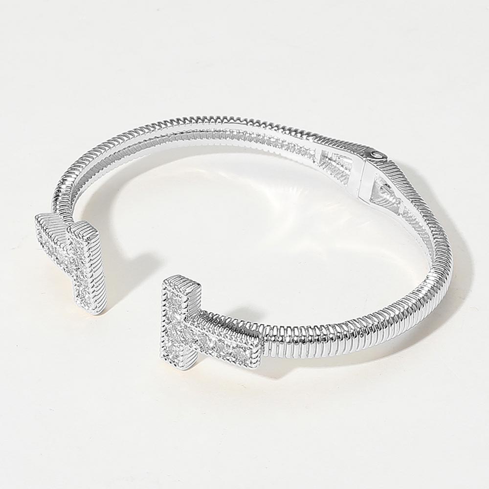 • Modern and stylish cuff bracelet featuring two pavĂ© crystal-encrusted "T" ends. A sleek, open design that adds a touch of sparkle and sophistication to any ensemble.