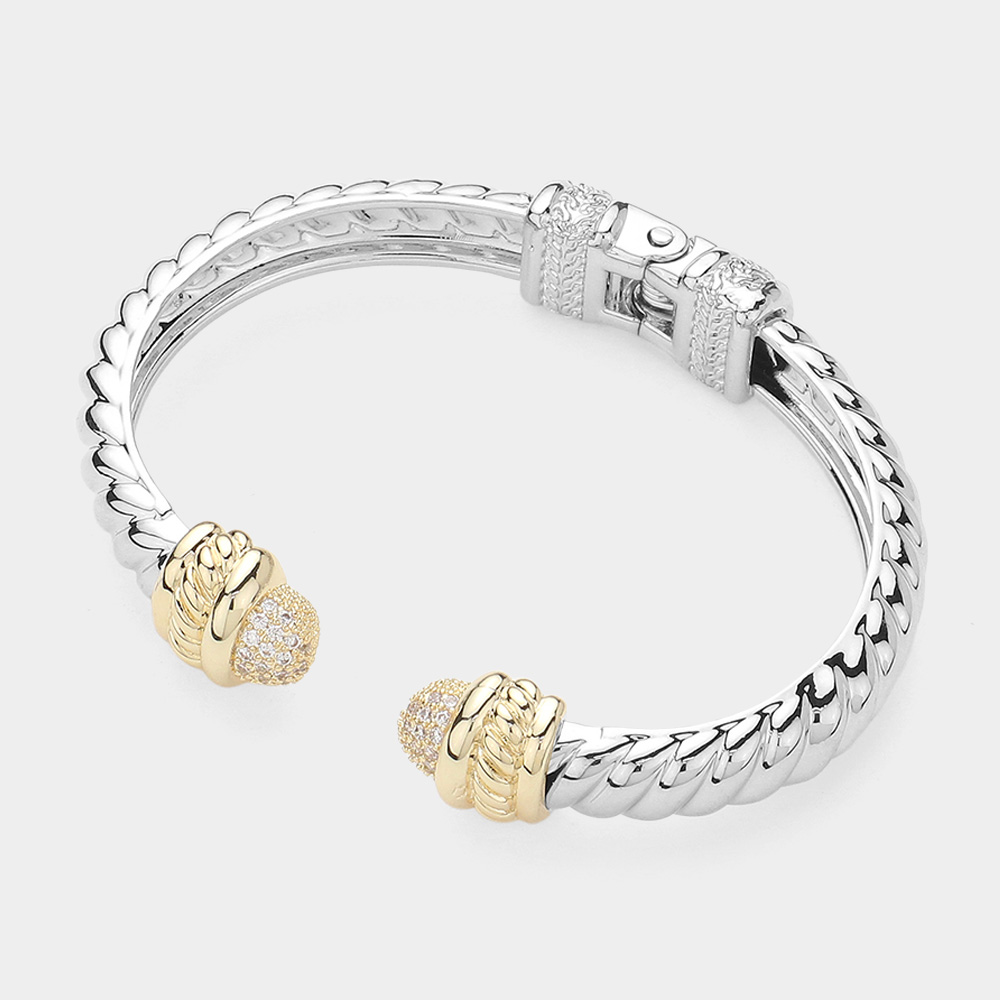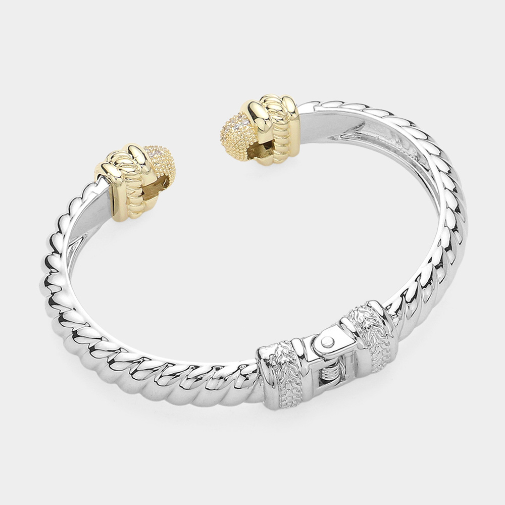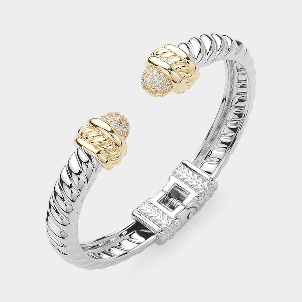 Details • Size : 0.6" H, 2.6" D • Hinged Closure • Elevate your style with this elegant cuff bracelet, featuring a modern open design and shimmering details. Perfect for stacking or wearing solo, this versatile accessory brings sophistication and shine to your everyday and special occasion looks. • Gold Dipped • CZ Cubic Zirconia