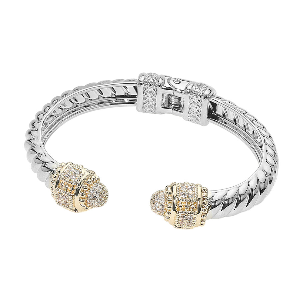 Details • Size : 0.75" H, 2.5" D • Cuff / Hinge Closure • Elegant textured cuff bracelet with ornate end caps adorned in sparkling multi-shaped stones. A sophisticated accessory that adds a unique touch to any outfit, combining vintage flair with modern luxury. • CZ Cubic Zirconia