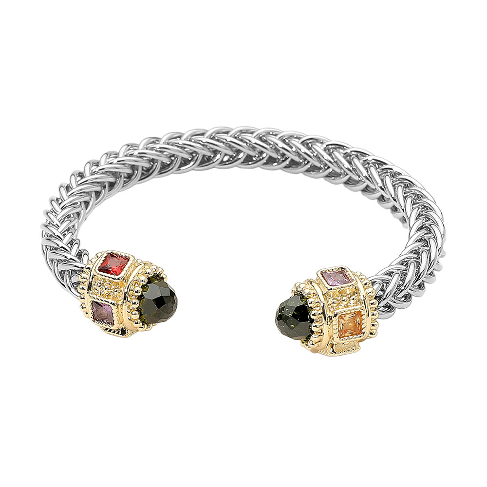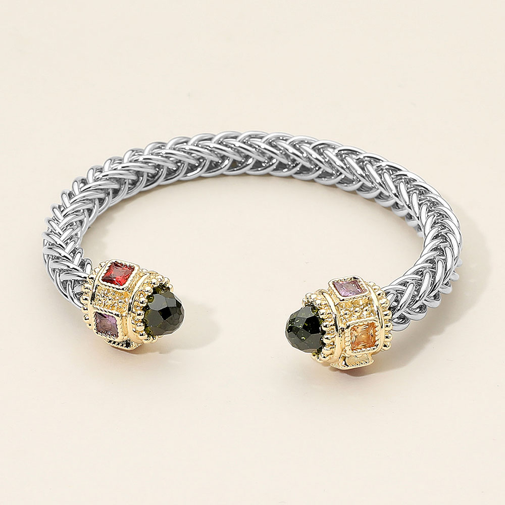 Details • Size : 0.5" H, 2.4" D • Cuff • This intricately braided cuff bracelet features gemstone-inspired end caps framed by ornate detailing for a touch of luxury. Its open design offers easy wear while the refined craftsmanship blends classic charm with a modern edge, ideal for elevated everyday style. • CZ Cubic Zirconia