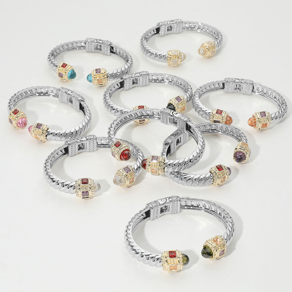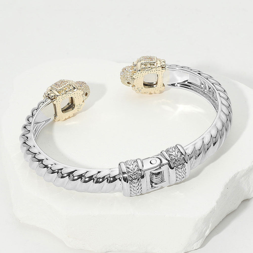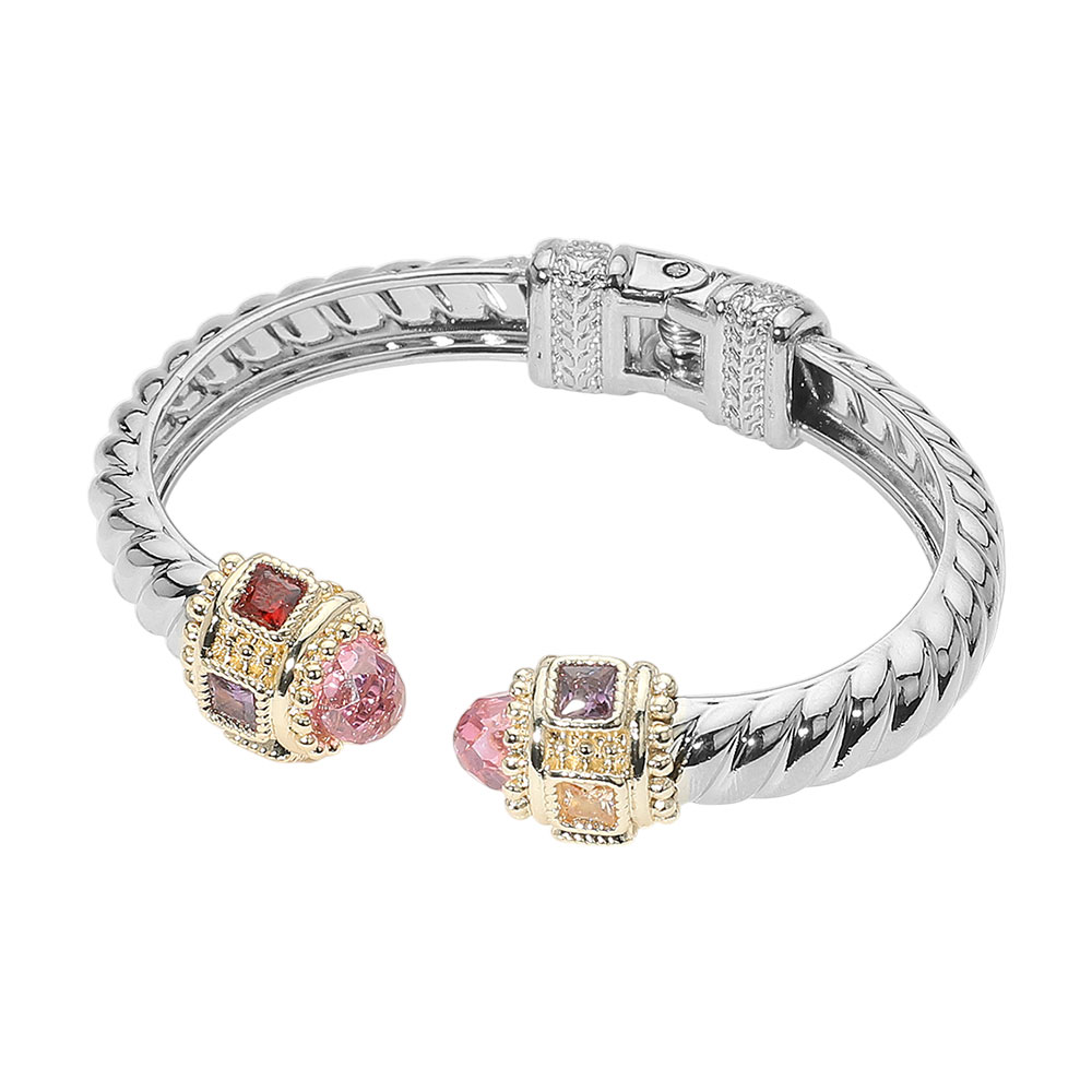 Details • Size : 0.75" H, 2.5" D • Cuff / Hinge Closure • Elegant textured cuff bracelet with ornate end caps adorned in sparkling multi-shaped stones. A sophisticated accessory that adds a unique touch to any outfit, combining vintage flair with modern luxury. • CZ Cubic Zirconia