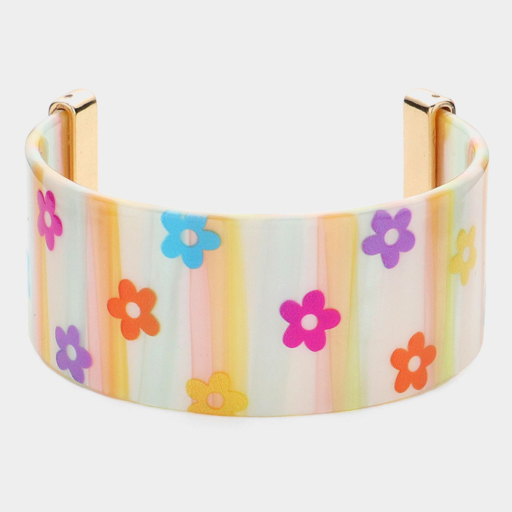 Flower Patterned Striped Resin Cuff Bracelet