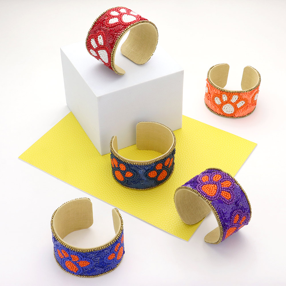 Details • Size : 1.6" H • Cuff • Show your team spirit with this bold beaded cuff bracelet featuring a paw print design. Perfect for game days, tailgates, or casual wear, it’s a fun and vibrant accessory for true fans.