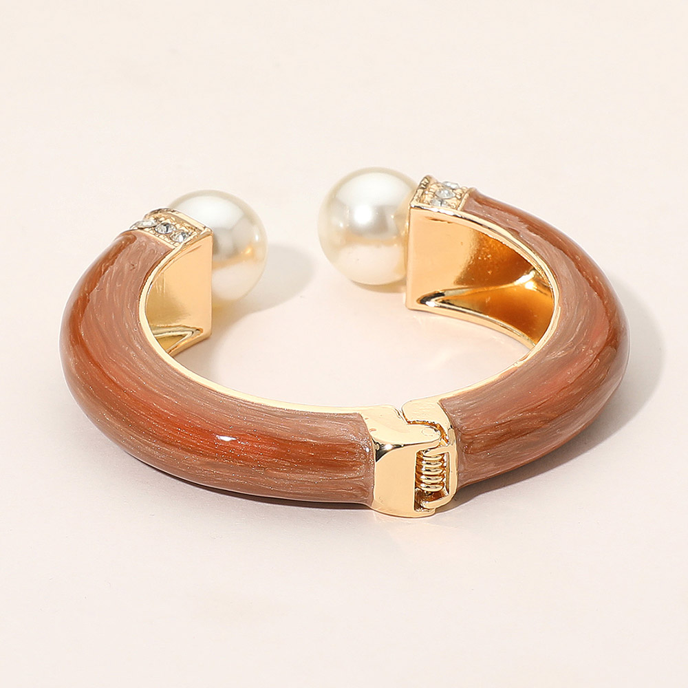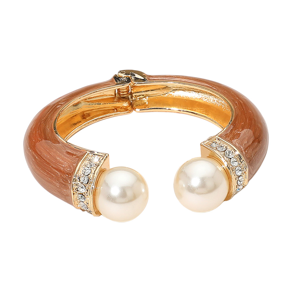 Details • Size : 0.75" H, 2.4" D • Cuff / Hinged Closure • Stylish open cuff bracelet featuring dual rounded ends accented with sparkling crystals. The smooth enamel surface and elegant shape make it a standout accessory for any outfit. Perfect blend of modern chic and timeless elegance for casual or dressy occasions. • Lead and Nickel Compliant • Gold Dipped