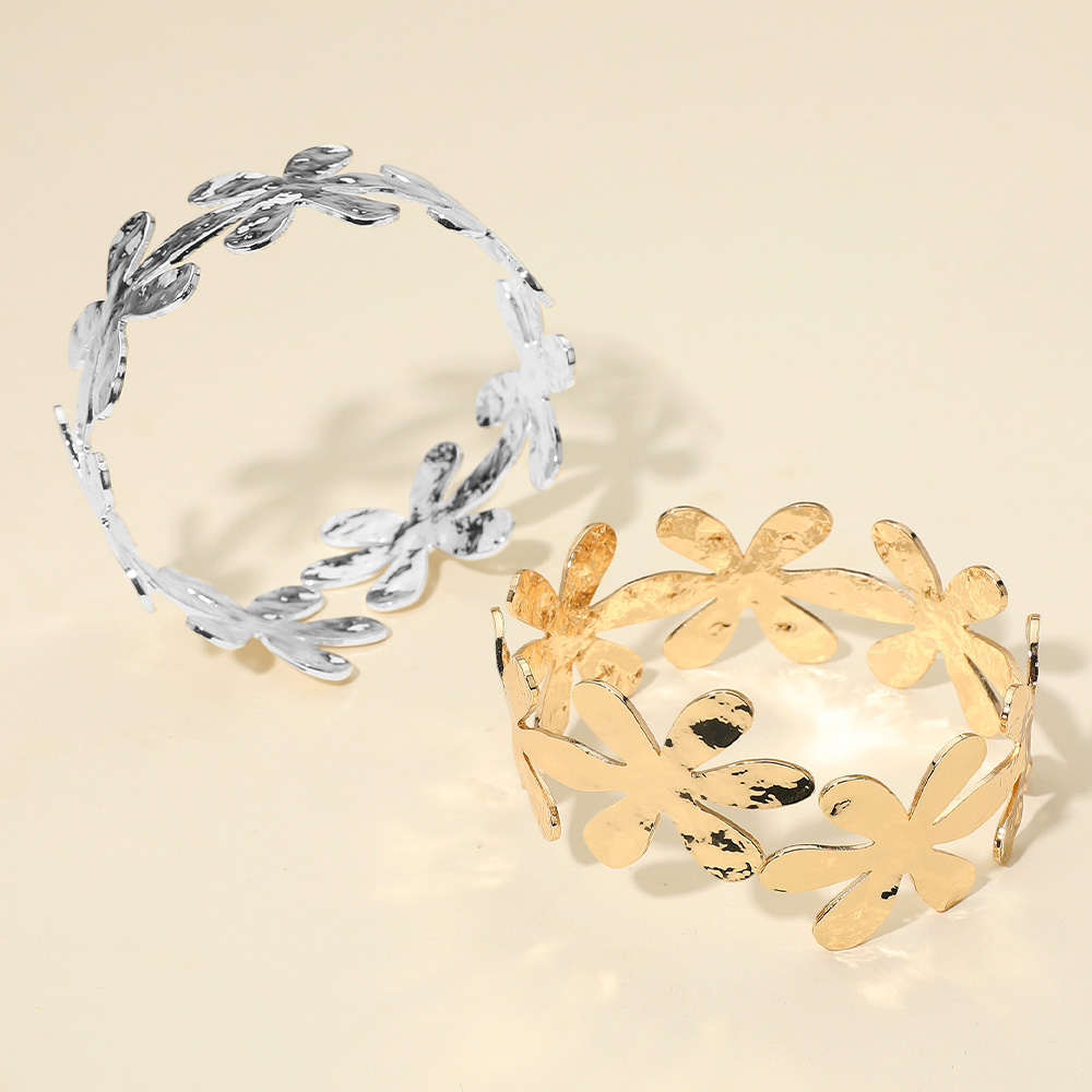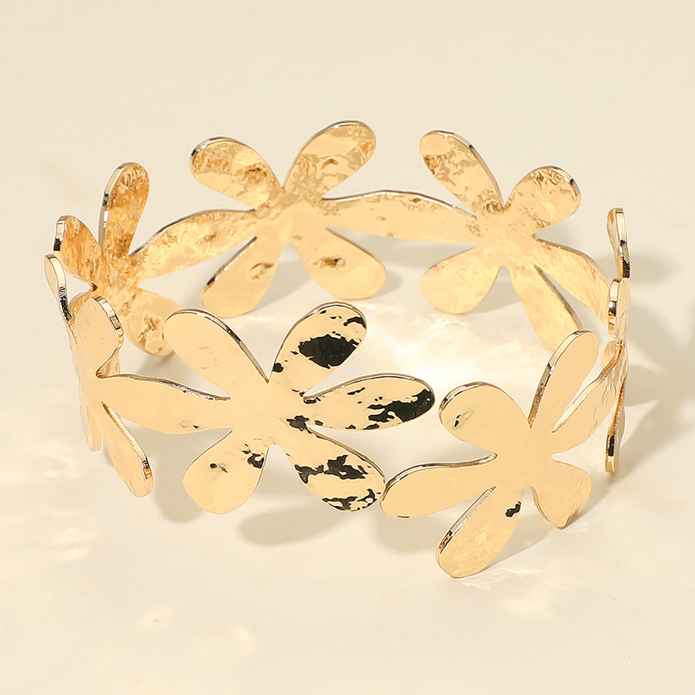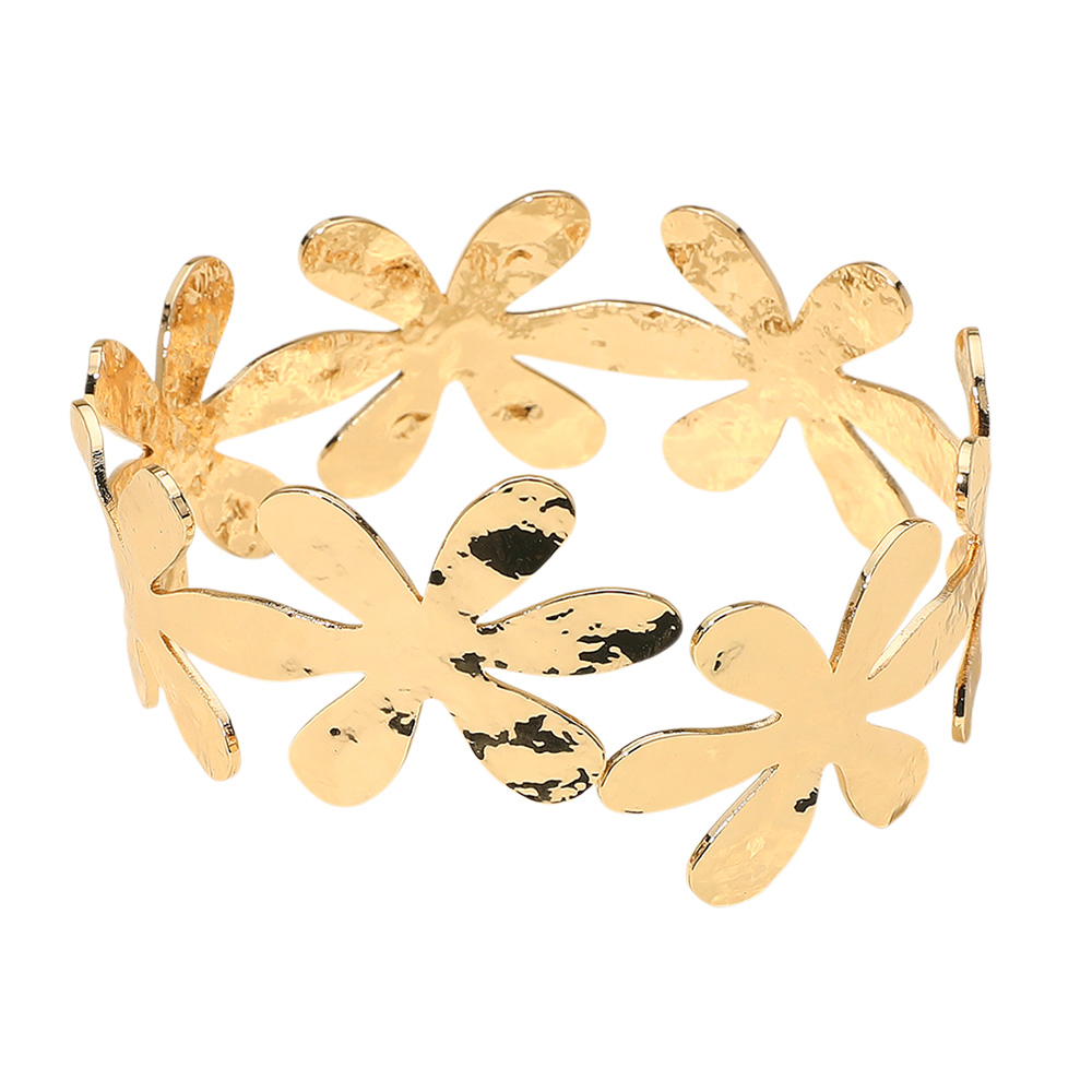 Details • Size : 1.1" H, 2.4" D • Cuff • A bold cuff bracelet featuring oversized hammered metal flower cutouts with an open design. Lightweight yet eye-catching, this piece adds a playful and modern touch to casual or dressy looks. Available in metallic finishes for versatile styling. • Lead and Nickel Compliant