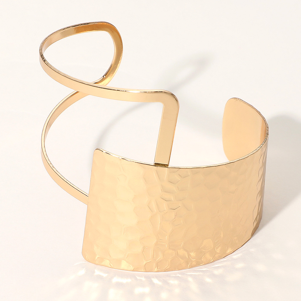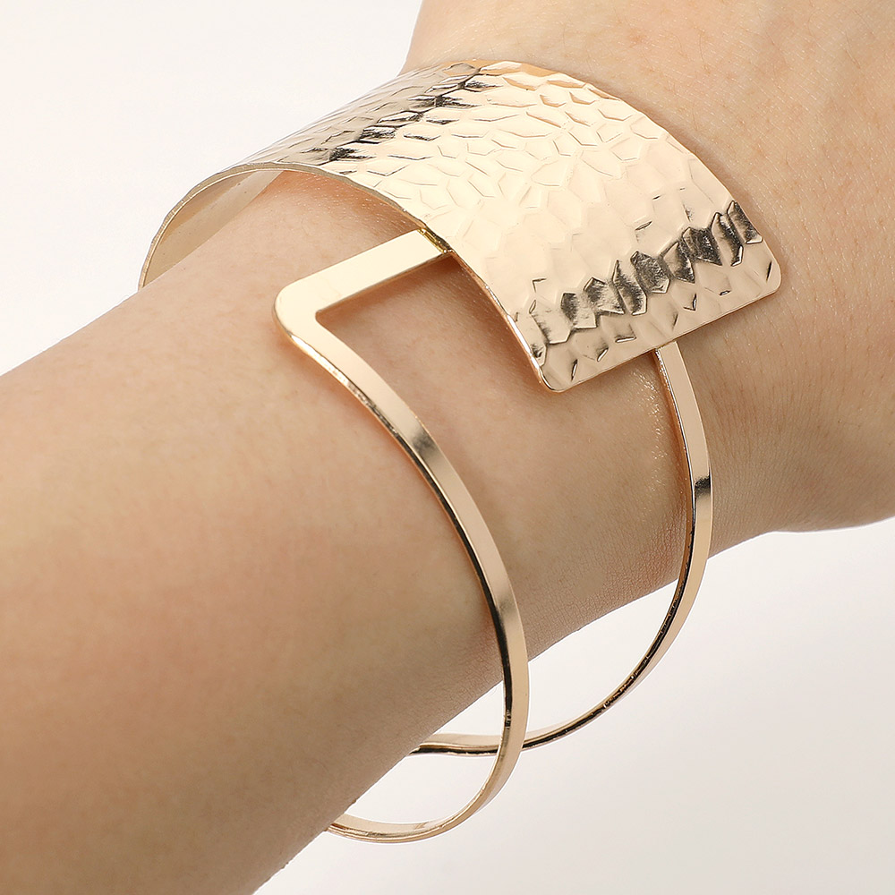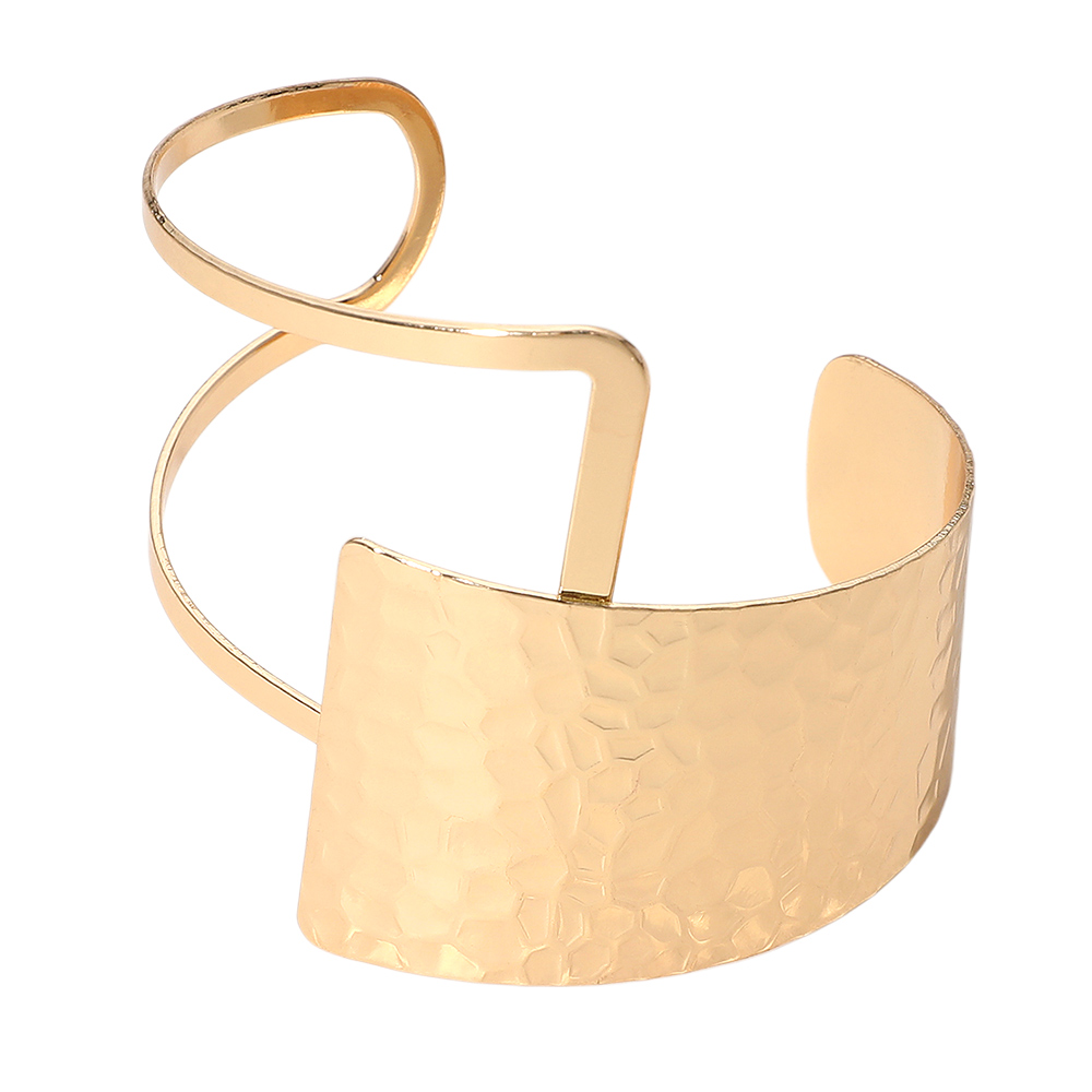 Details • Size : 2.25" H, 2.3" D • Cuff • Modern open cuff bracelet featuring a wide hammered panel and sleek geometric frame. A bold accessory that adds architectural flair to any outfit, perfect for elevating both casual and formal looks. • Lead and Nickel Compliant