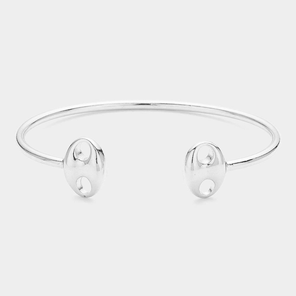 • Sleek and contemporary, this open cuff bracelet features two oval-shaped accents at each end for a minimalist yet eye-catching finish. A versatile piece that complements both everyday outfits and dressier ensembles with ease.