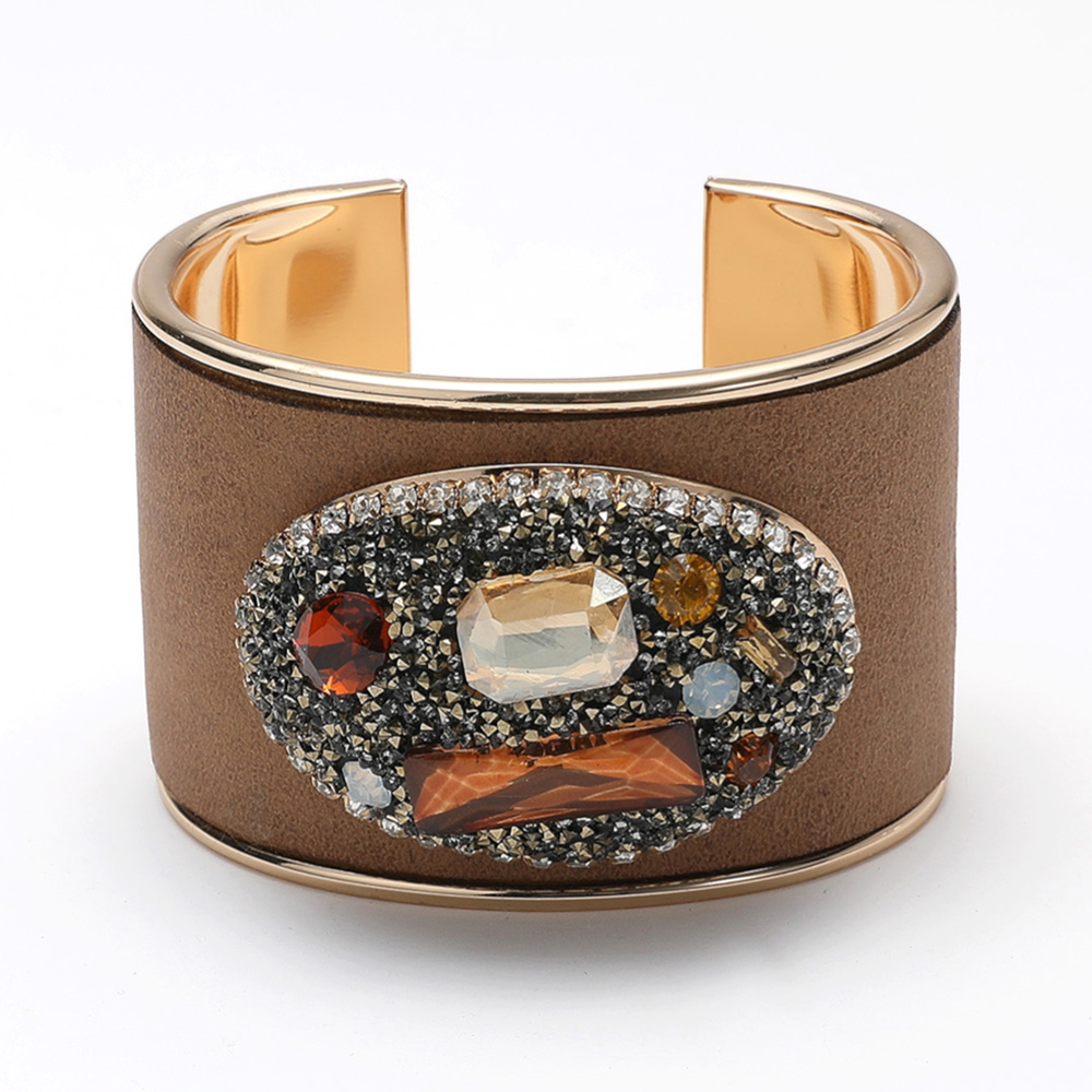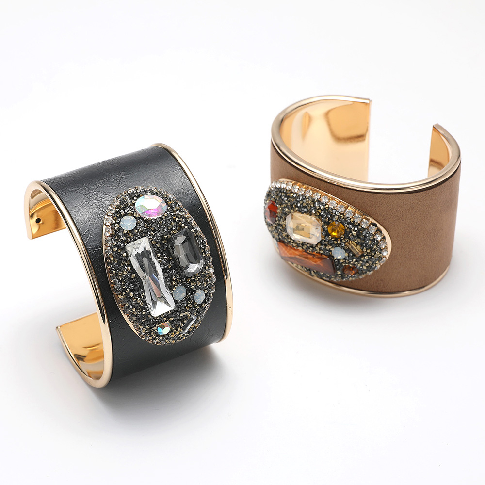 Oval Glass Stone Embellished Bling Studded Pointed Faux Leather Cuff Bracelet