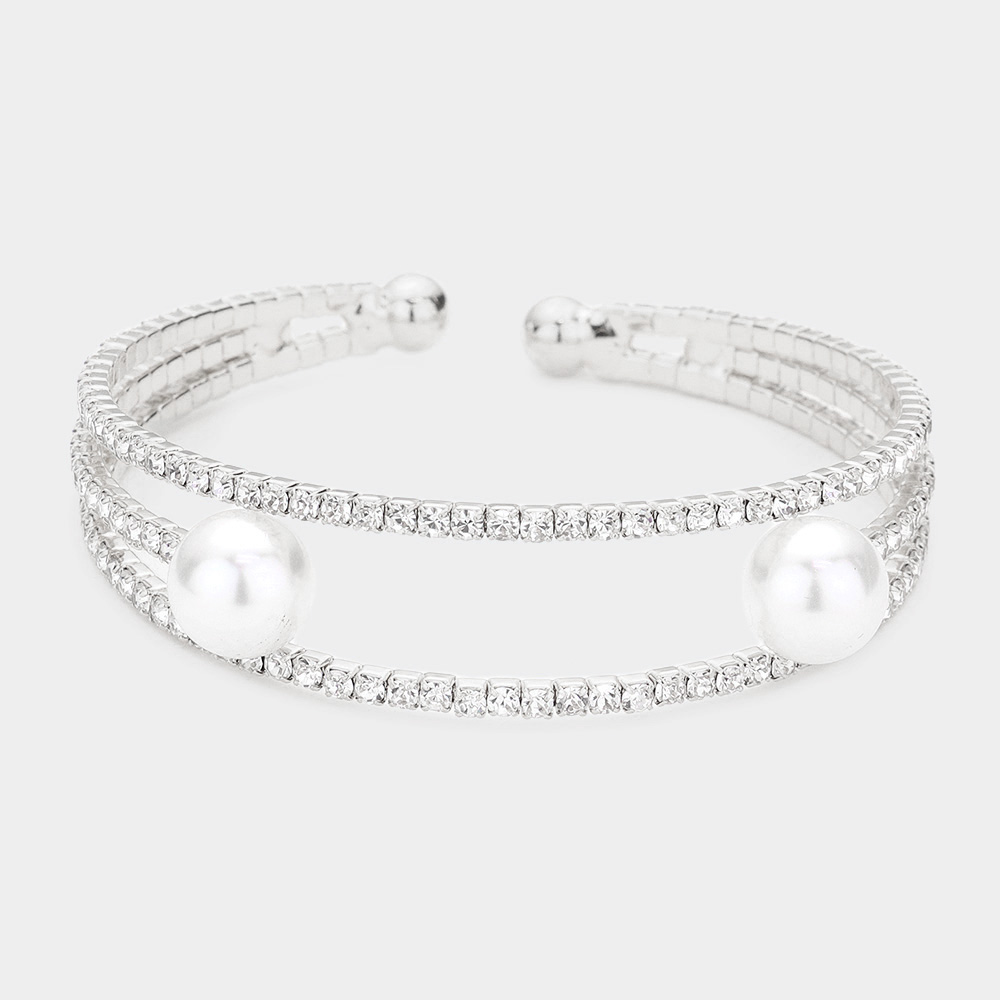 Pearl Accented Split Rhinestone Cuff Evening Bracelet