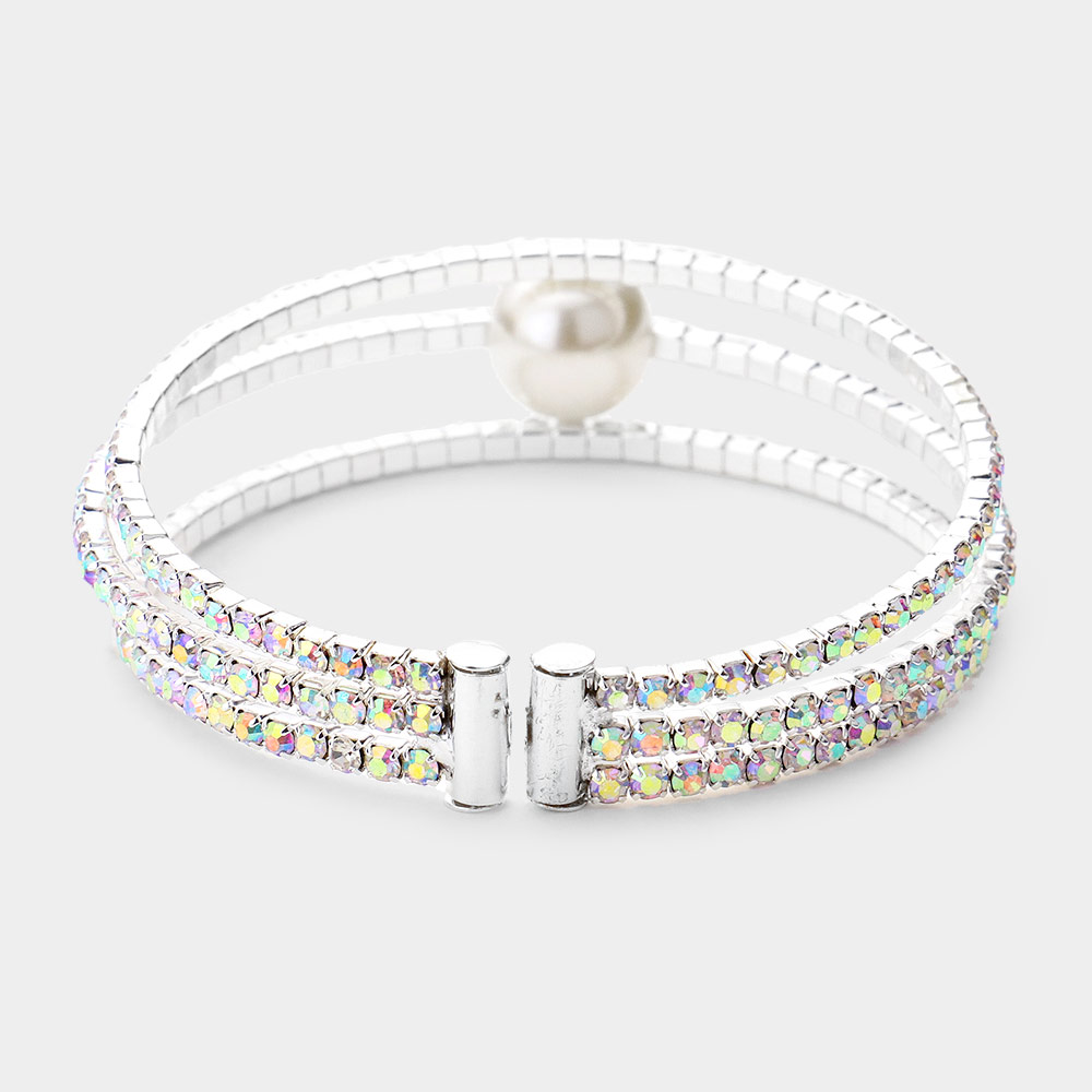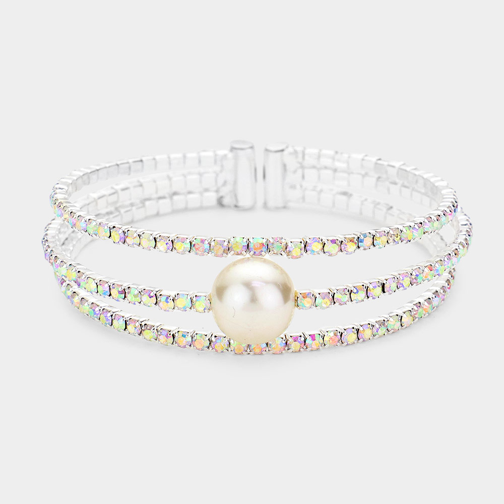 Pearl Accented Split Rhinestone Evening Cuff Bracelet