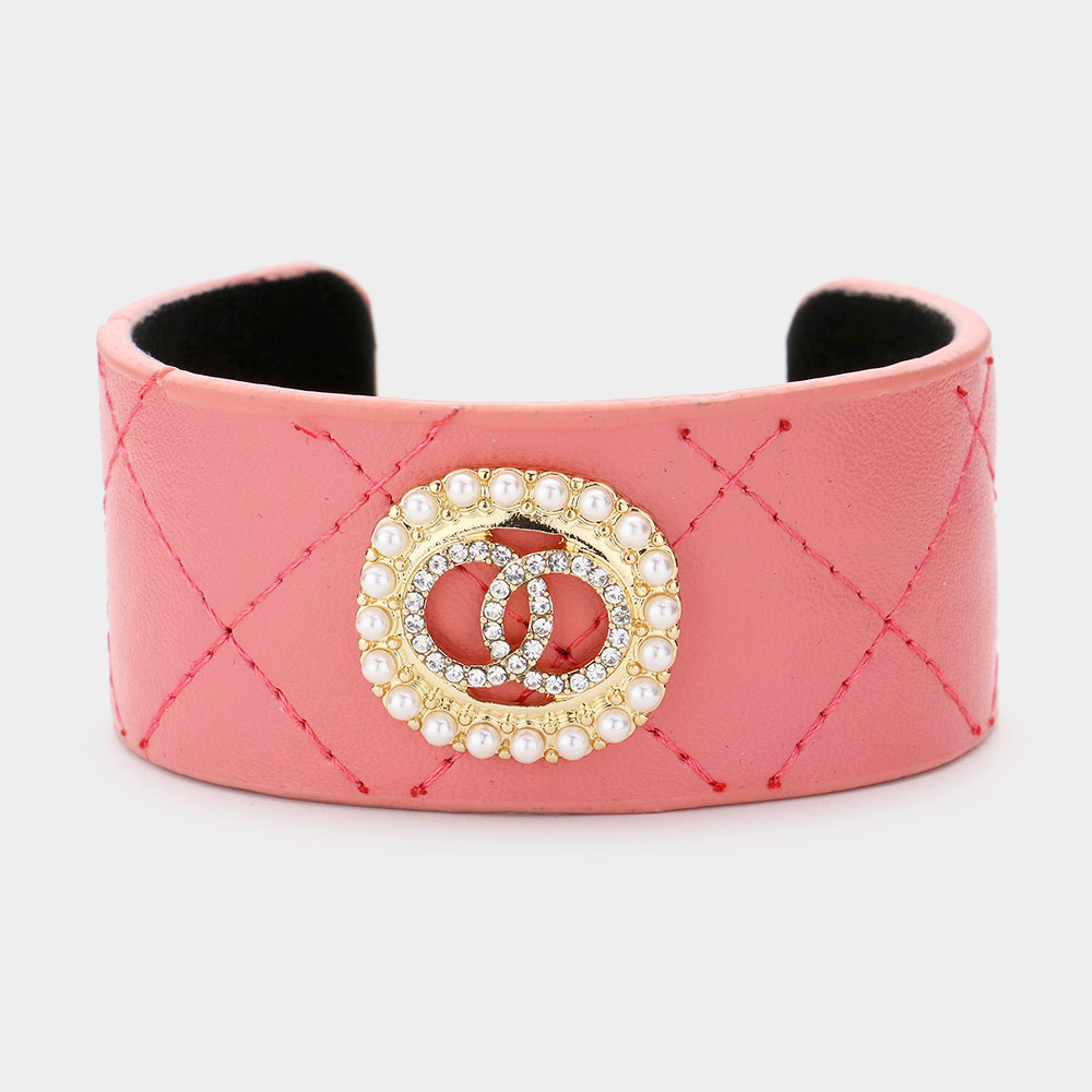 Pearl Trimmed Rhinestone Double Open Circle Accented Faux Leather Cuff Bracelet