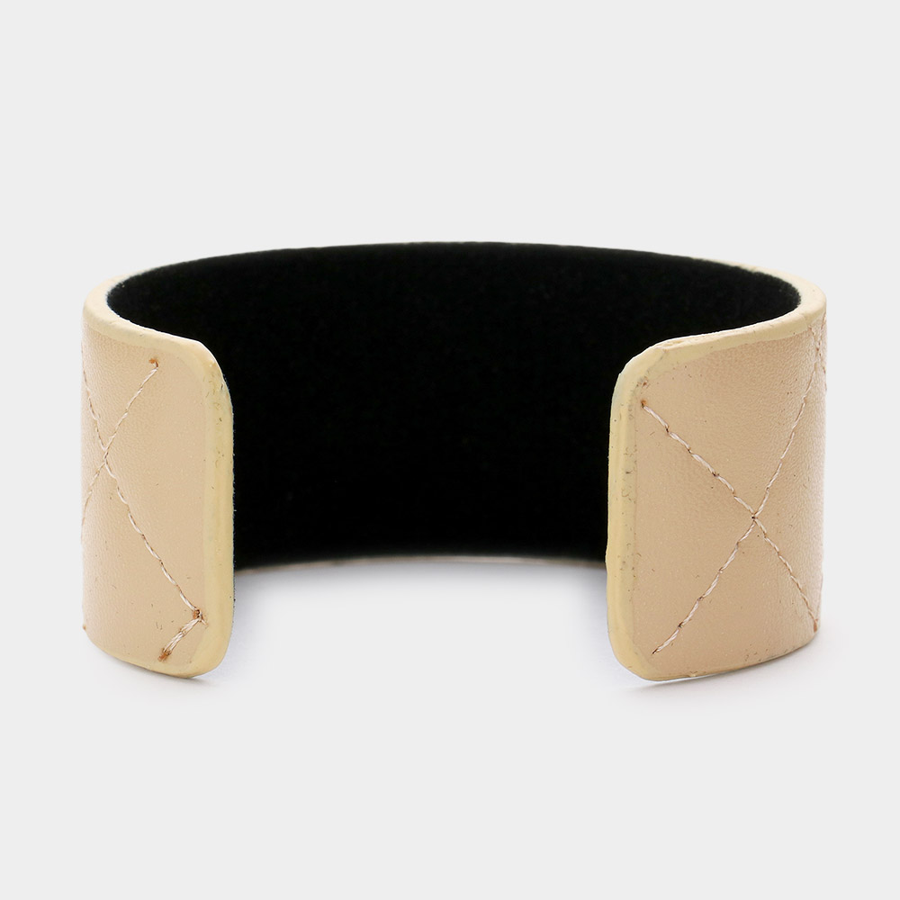 • Chic beige cuff bracelet with a quilted pattern, adorned with a sparkling bee centerpiece framed in pearls—perfect for adding charm and elegance to any outfit. Stylish, versatile, and uniquely detailed.